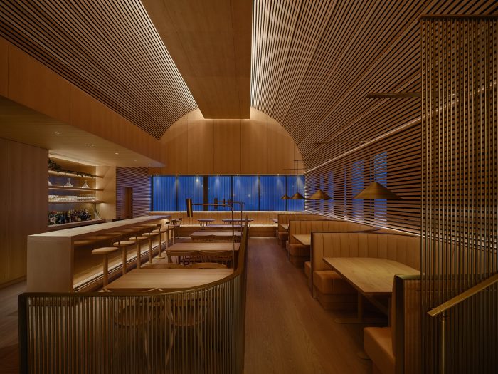 PSP is unexpected - a space to truly experience in person. The main entry is located in a quiet courtyard, drawing patrons away from the humming urban activity of Queen Street West. Upon entry into the main dining space, patrons are presented with a two-story wood slat vault suspended from the roof above. A wood-clad cloud runs the length of the restaurant and filters indirect natural light, creating a so glow in the interior. Vertical brass screens filter activity from the street to provide privacy and intimacy while maintaining a subdued connection to the streetscape beyond.
