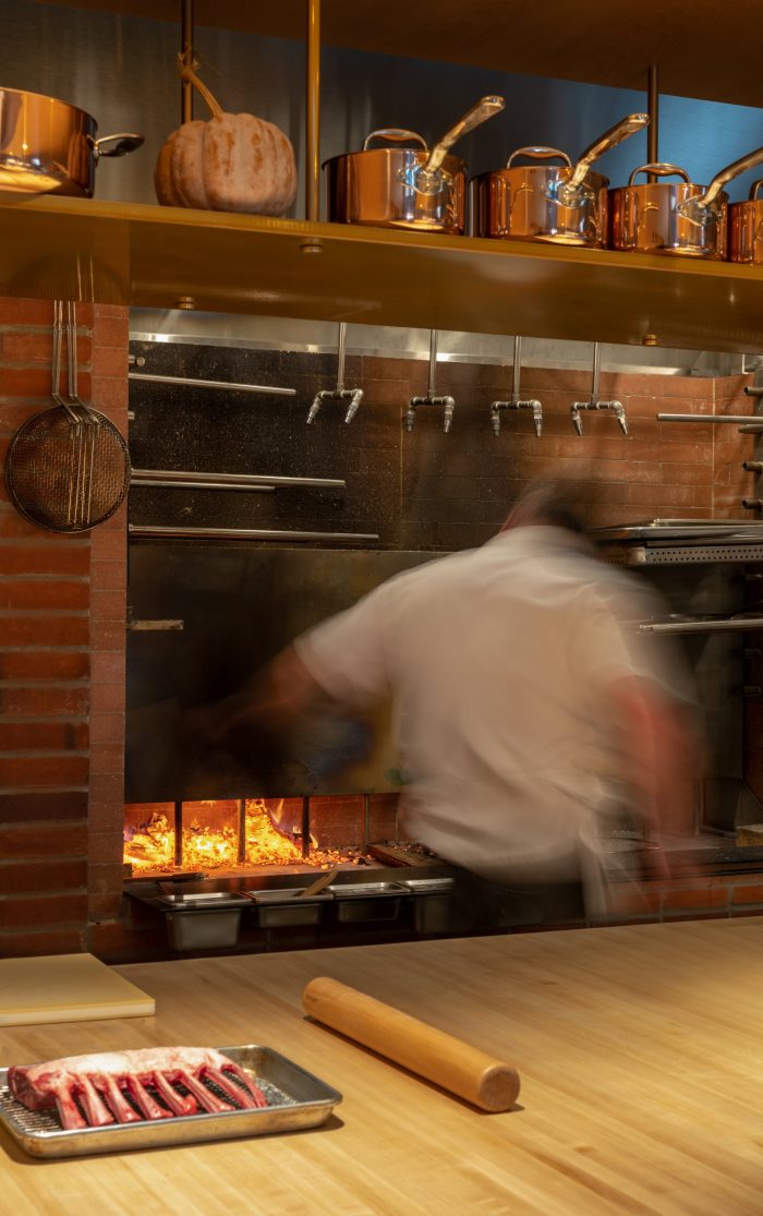 OGA collaborated with Coolican & Company on custom furniture, including the large booth tables with a concealed drawer for the restaurant’s Perceval steak knives from Thiers, France. Coolican’s special edition maple “Edwin Chair” incorporated brass spindles to reference the brass screens throughout the main dining space.