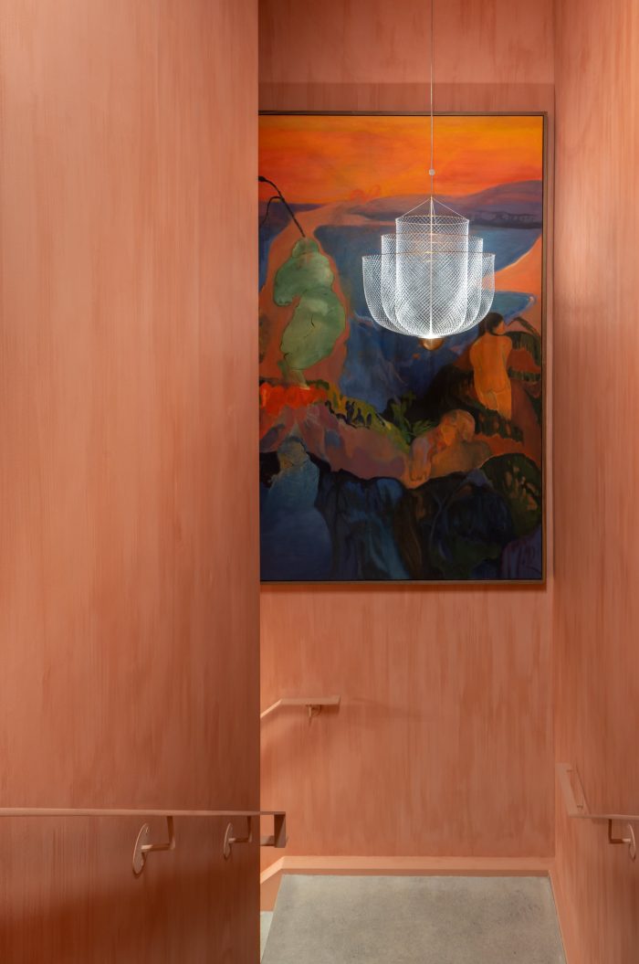 The double-height accessible restroom lined with textured Bianco Carrara bamboo le is washed in natural light from the skylight above. The design of Brandon Gore’s custom concrete sink is inspired by a hydrological map of Lake Erie and incorporates a recessed brass marker indicating May’s farm in Fort Erie.