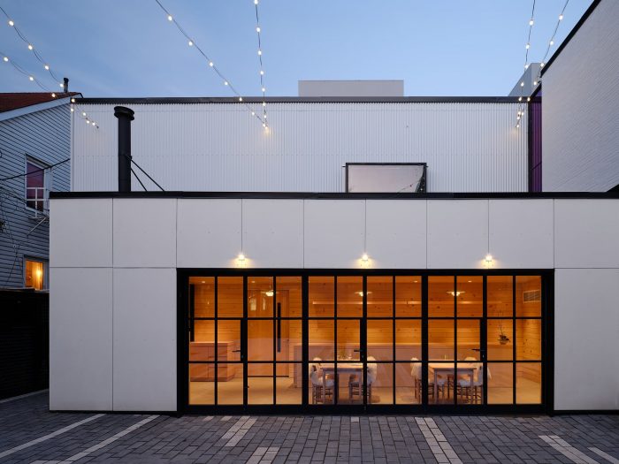In contrast to the main dining space, the white-washed pine interior and wood-burning stove of the rear addition are reminiscent of Ontario's cottage country. Three pairs of steel and glass doors open the space to the exterior courtyard that fills with warm evening light in the summer months.