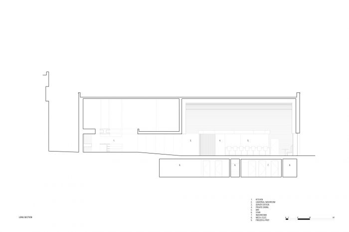 PSP是出乎意料的--一个需要真正亲自体验的空间。主入口位于一个安静的院子里,吸引顾客远离皇后西街的嗡嗡作响的城市活动。进入主餐饮空间后,顾客看到的是一个悬挂在屋顶上的两层木板拱顶。一个木质的云层贯穿了整个餐厅,过滤了间接的自然光,在室内创造出一种柔和的光辉。垂直的黄铜屏风过滤来自街道的活动,以提供隐私和亲密感,同时保持与街道景观的低调联系。