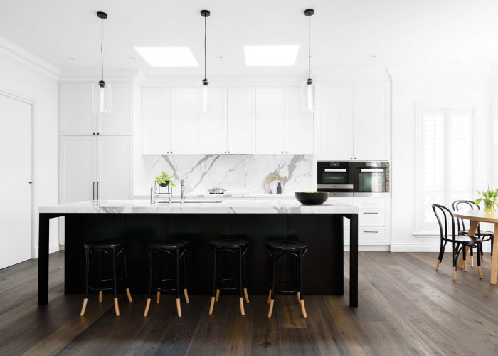 Located in Melbourne’s leafy suburb of Ivanhoe, this once traditional family home has been transformed into a modern interpretation of a Hamptons’ style home – an aesthetic that combines a light palette, sophistication and elegance. The heart of the home is formed through clean, crisp lines of the kitchen, paired with our generous Calcutta marble island bench and its contrasting black American Oak joinery. To meet our client’s requirements, the open-plan design is spacious and embraces the abundance of natural light, giving it a homely feel that is visually impressive and welcoming to all.