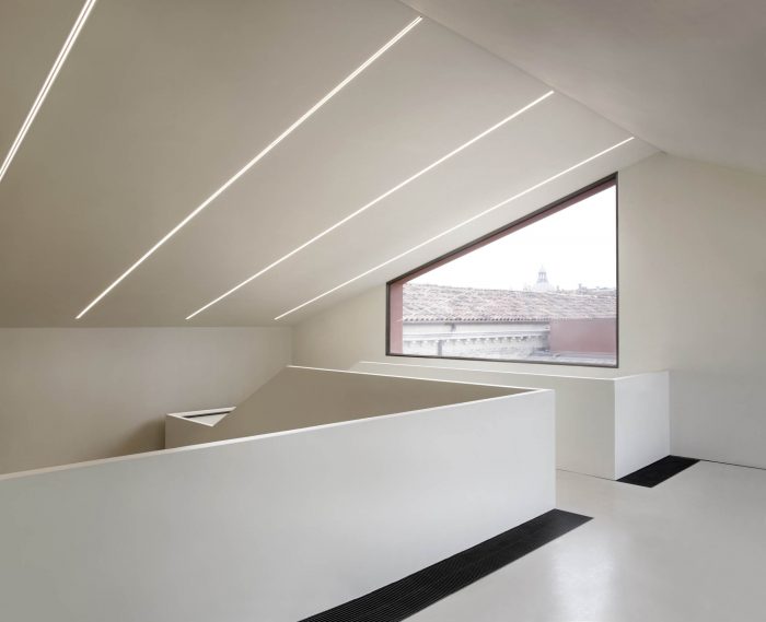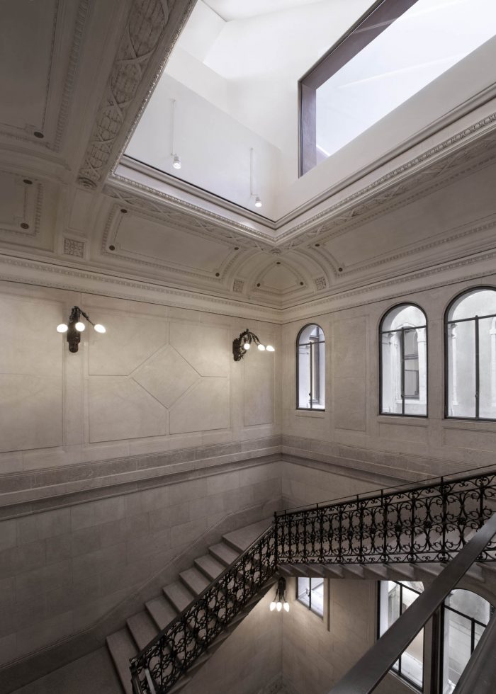 The Interventions include the Restoration of the first and second floors, where the most prestigious Offices of the Generali insurance company are situated, the Reorganisation of accessibility and usability through the inclusion of new vertical circulation, and the Renovation of the third floor, with public access to the exhibition spaces as well as workspaces, event spaces and an auditorium linked to The Human Safety Net.