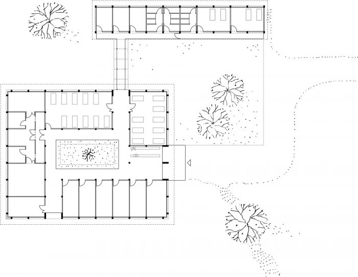村庄一侧远离大海的一座小山被选为新建筑的地点。由于位置较高,该建筑在热带风暴和海啸期间也是安全的避难所。a+r Architekten开发了一个单层的中庭房屋,作为主楼。遮蔽的内院是该建筑的核心;它既是一个休息区,也是一个公共空间。围绕它的是病人房间、治疗和工作人员房间以及药房。为了最大限度地减少疾病的传播,等候区设在室外。具有独特的单坡屋顶的直线型侧翼通过一个凉棚进入。它容纳了一个隔离病房,并为传染病人提供了额外的房间,还有厨房--用于自炊,这在缅甸很常见--以及储藏室、盥洗室和卫生设施。