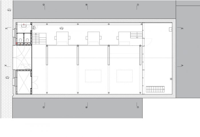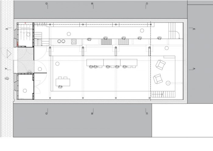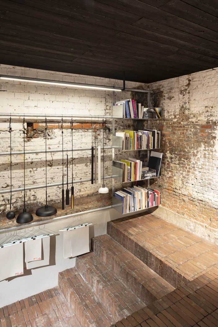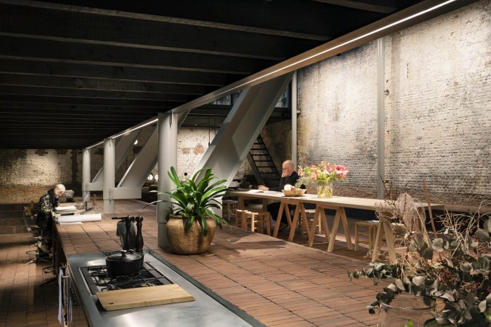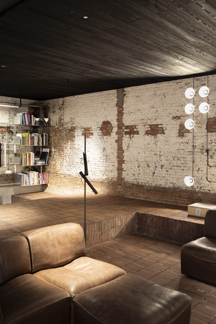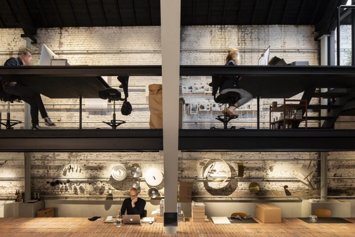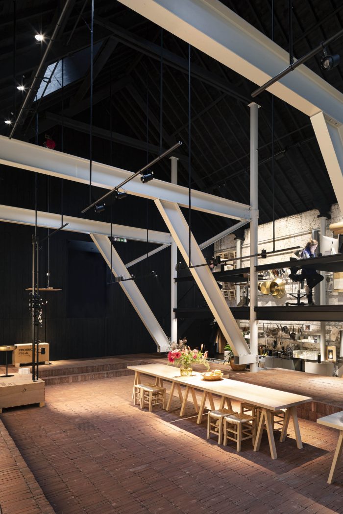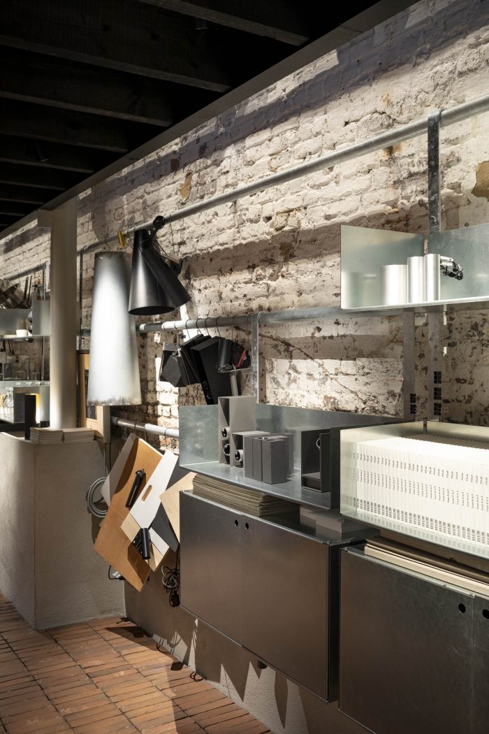 The workshop is a mix of new and existing constructions and levels and forms a creative platform for employees and customers alike. Earthy colours and basic materials are bathed in subtle dim light.