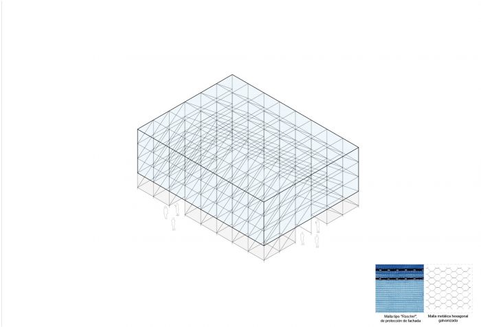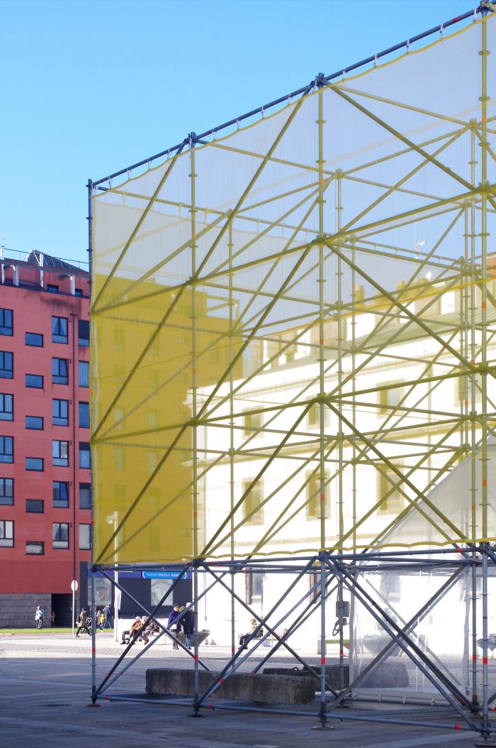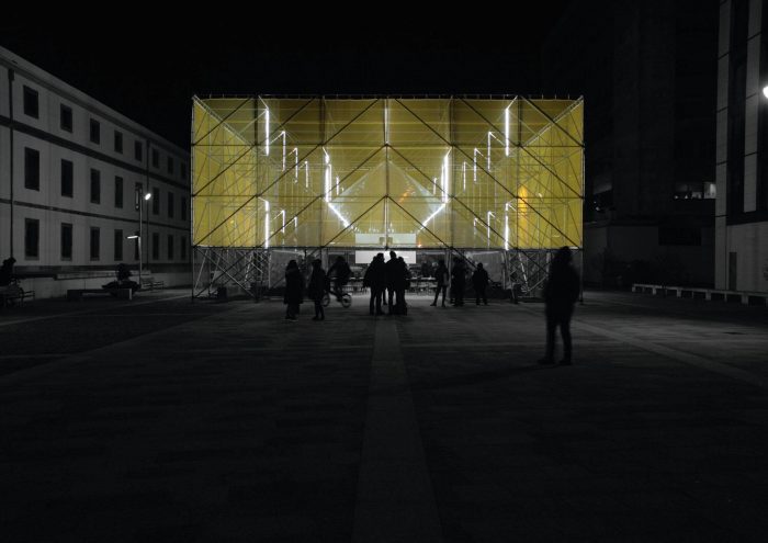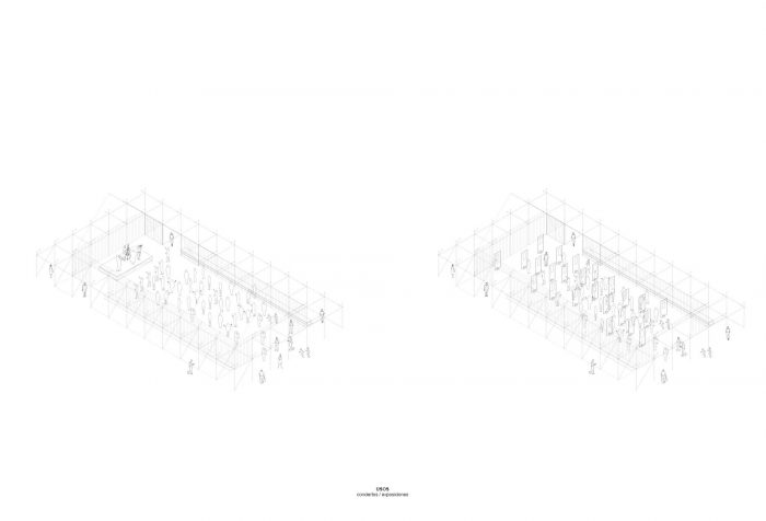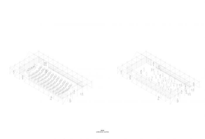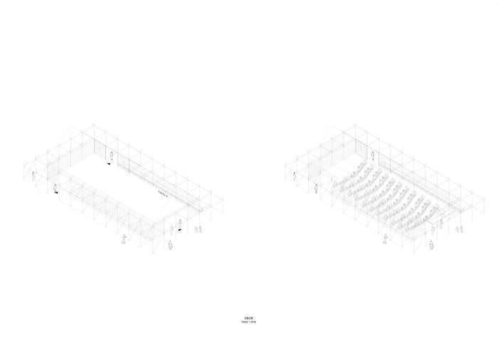 Due to the ephemeral nature of the project, the construction is based on detachable and reusable elements assembling a complex system of scaffolds, the result is a permeable and immersive mesh, able to host multiple uses along its time.