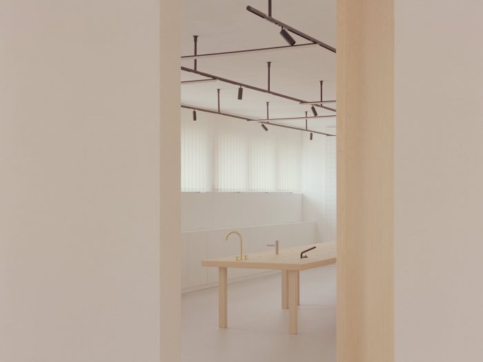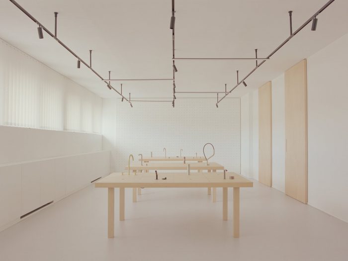 The layout has been designed to display all the collections in a flexible and easily remodeled manner: the walls that form the backdrop to the space are covered with panels with a regular pattern of holes, while in the center of the space are four birch tables with tops divided into interchangeable panels. On the ceiling, an infrastructure of light ensures suitable lighting for each set-up.
