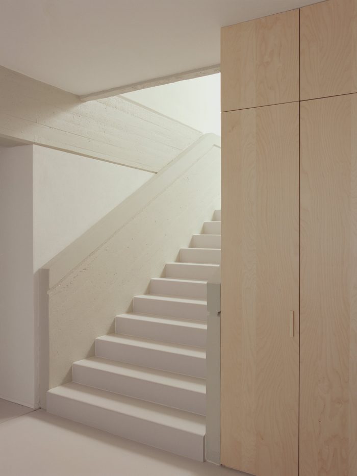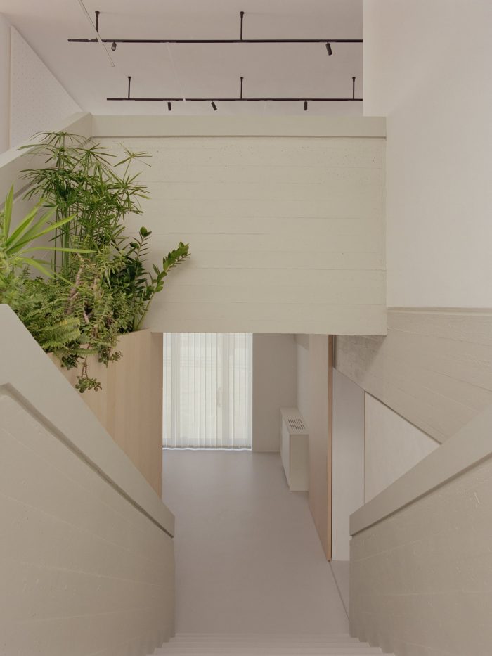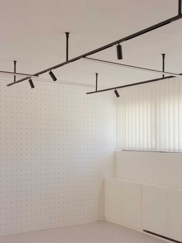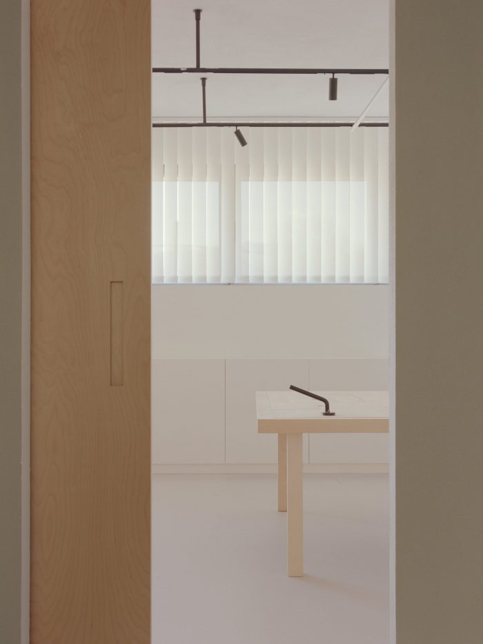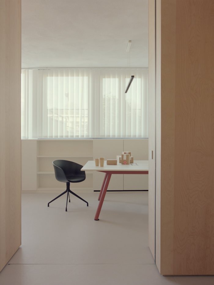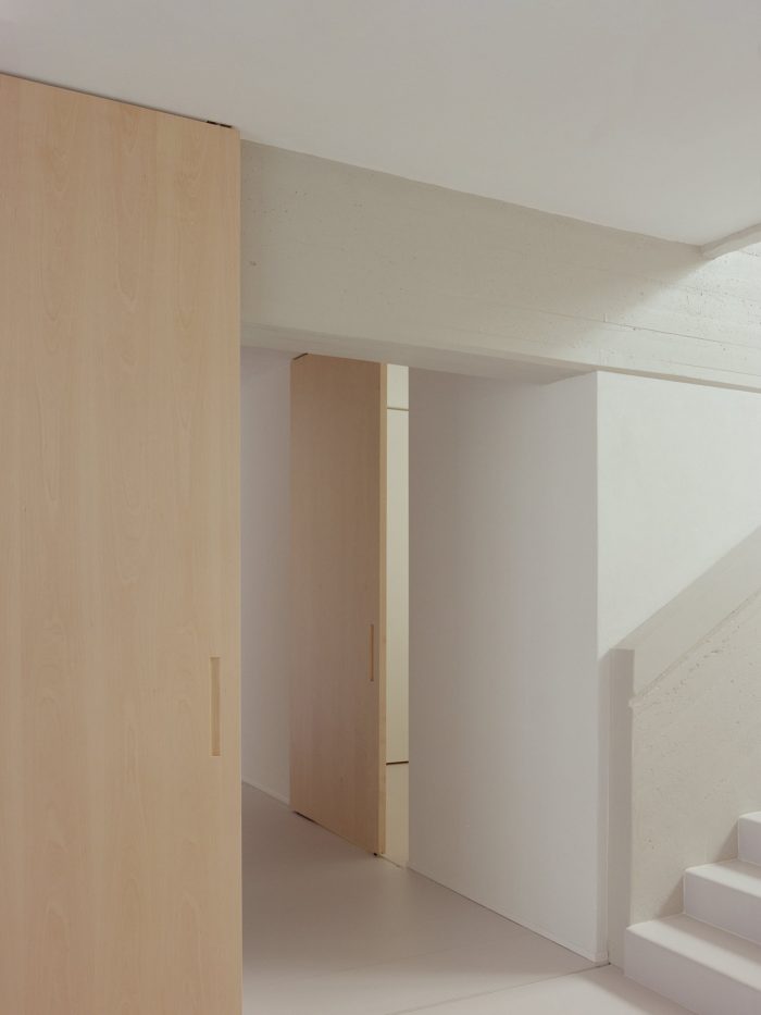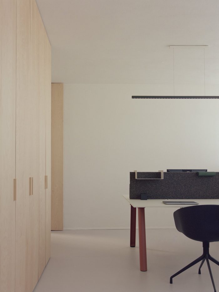 As well as acting as a container, these elements give the rooms a hierarchy and allow them to be separated through integrated sliding walls. The offices, that required more privacy, as well as the employee toilets and the server room, have been placed in the southern service strip between the entrance and the staircase to the first floor.