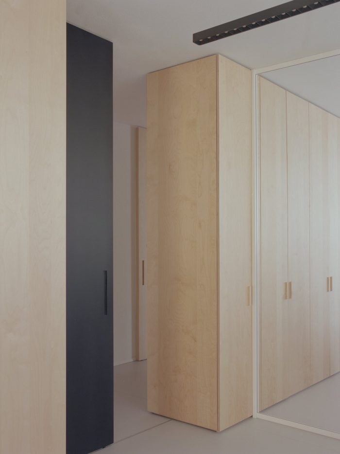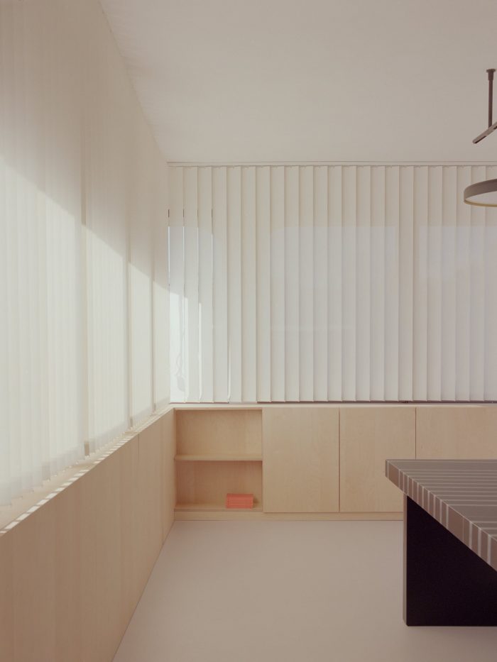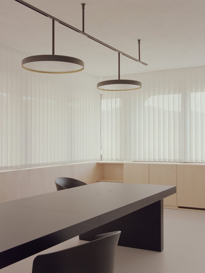 会议室的特点是三面都有连续的窗户,由桦木镶板强调,在短边上,桦木镶板有了身体,成为一个容器元素;在空间的中心是一个黑色Fenix的大型雕塑般的会议桌。自然光通过一个带有可调节垂直带的百叶窗系统进行管理,可以在整个工作日内对照明进行完美的调节。