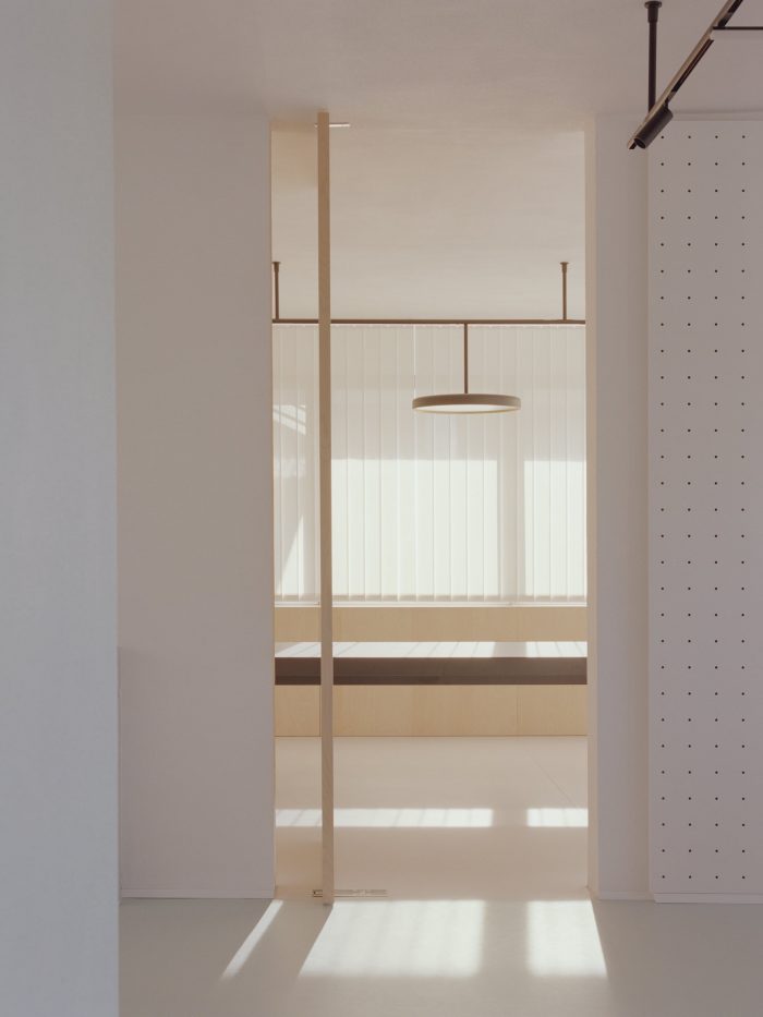 在上楼之前,在更衣室和茶水间附近,有一个非正式的休闲区;一个桦木体量被插入地板下的区域,以管理生产和管理区域之间的分离,并伴随着访客到上层的空间。在作为公司陈列室的大型开放空间内,产品展示成为主角。