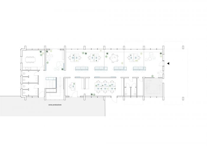 Before going up to the upper floor, near the changing rooms and the refreshment room, there is an informal relaxation area; a birch wood volume is inserted in the under-floor area to manage the separation between the production and management areas and accompanies the visitor to the spaces on the upper floor. Inside the large open space that serves as the company showroom, the product display becomes the protagonist.