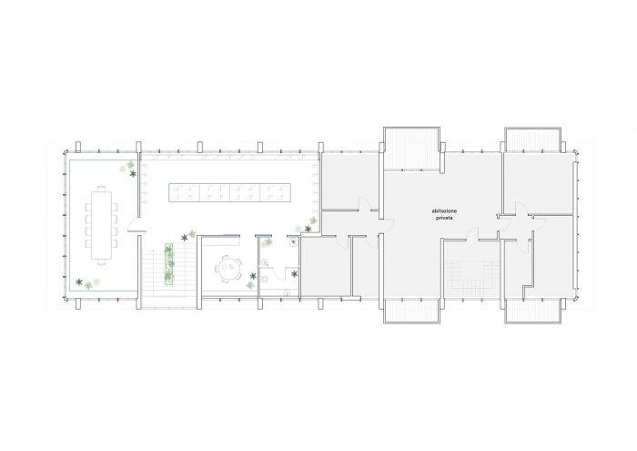 除了作为一个容器,这些元素给了房间一个层次,并允许他们通过集成的滑动墙进行分离。需要更多隐私的办公室,以及员工厕所和服务器室,被放置在入口和通往一楼的楼梯之间的南部服务地带。