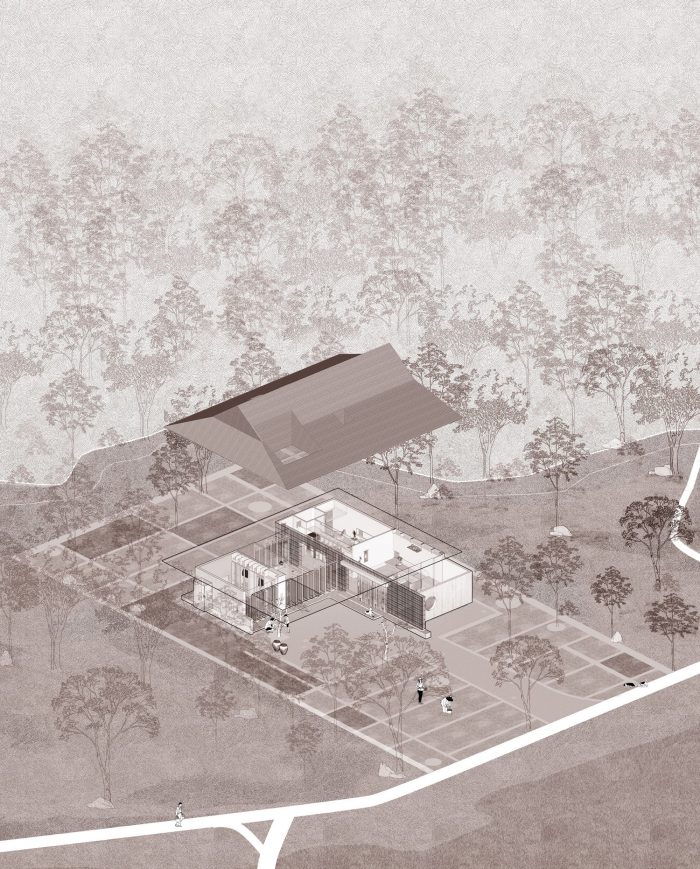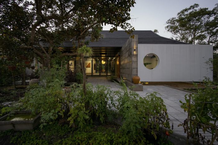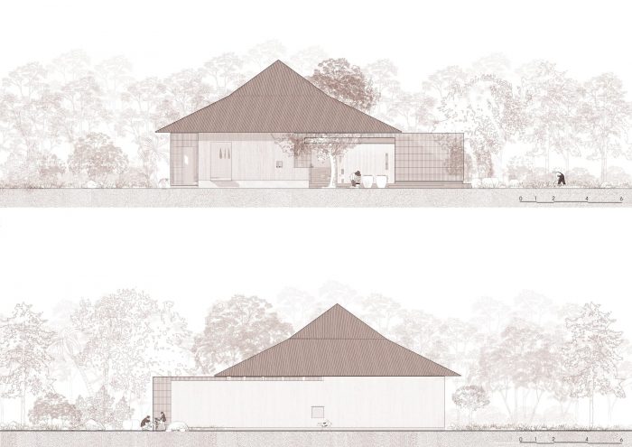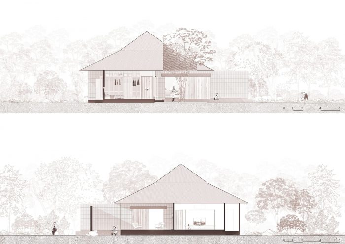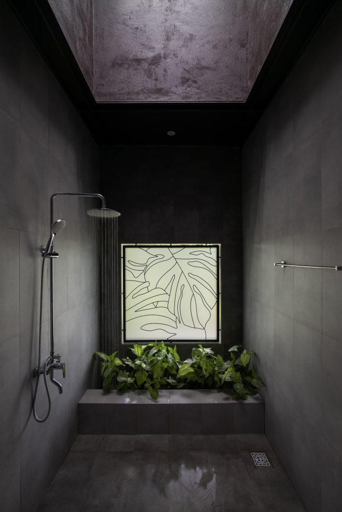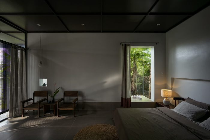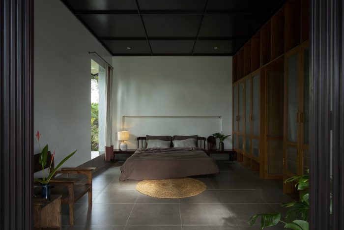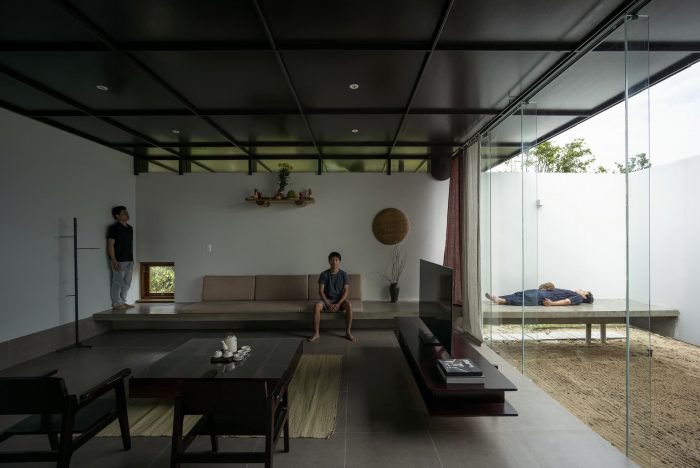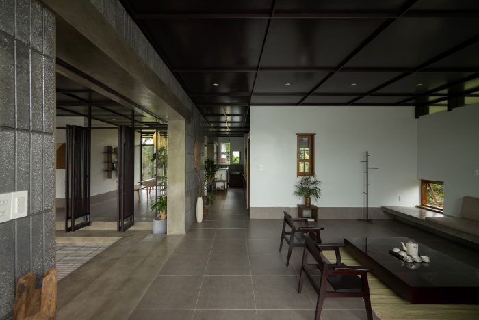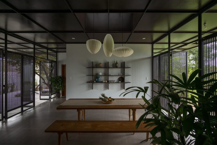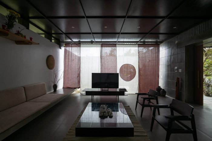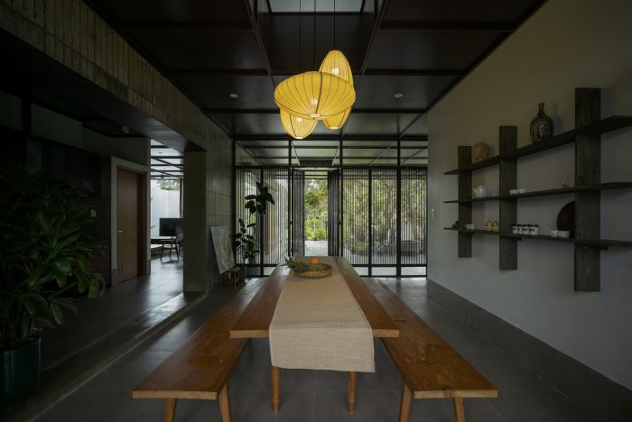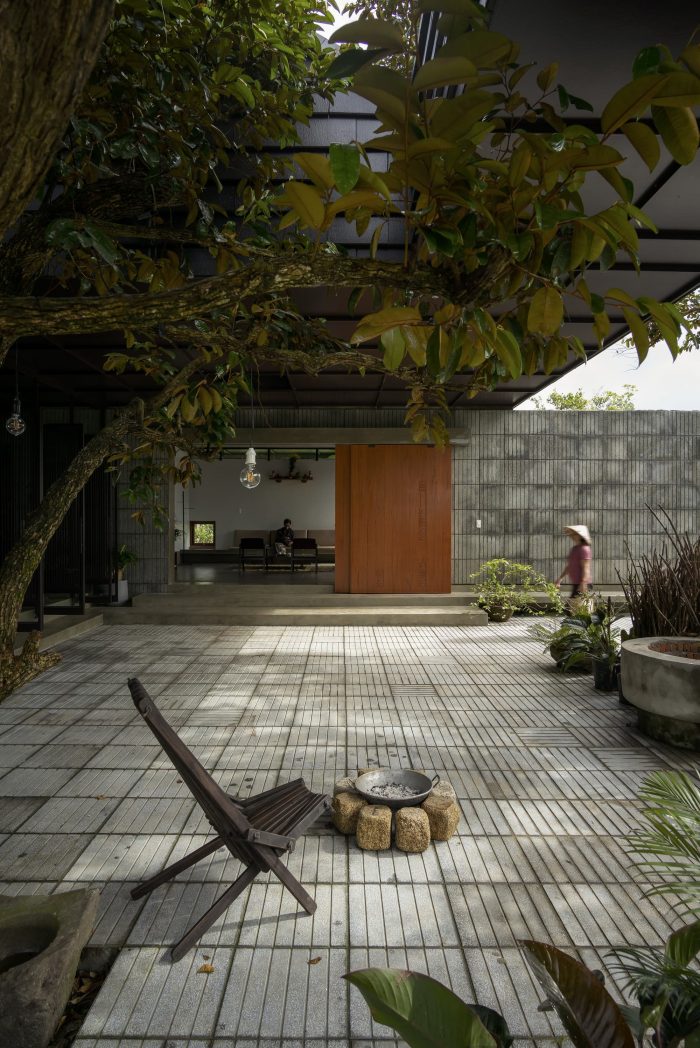 Crossing the alley in the middle of the acacia forest, the roof of Quế Sơn house is looming in the green background. That large roof block covers the entire building, indoor and outdoor spaces into a bulk. With the thickness to create a good insulation space, the large-aperture eave helps to regulate the shade and coolness of the building at a moderate level, limiting the harshness of the central climate.