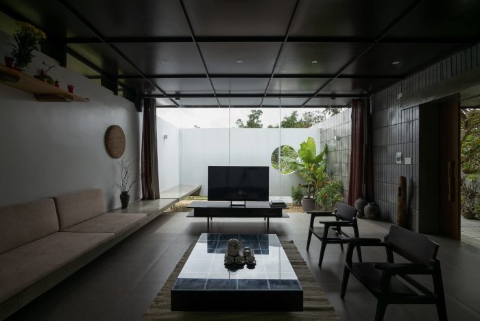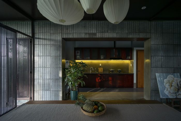 The flat ceiling system has a low height, spreading under the roof block, creating an invisible pressure so that the eye always has horizontal focus, from which we try to create "panting" of the garden through the roof. Through the gaps, succinct and still, only humans relax with nature. With the routine of the old house, the kitchen is the place where family members often gather to eat, drink and gossip together.