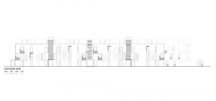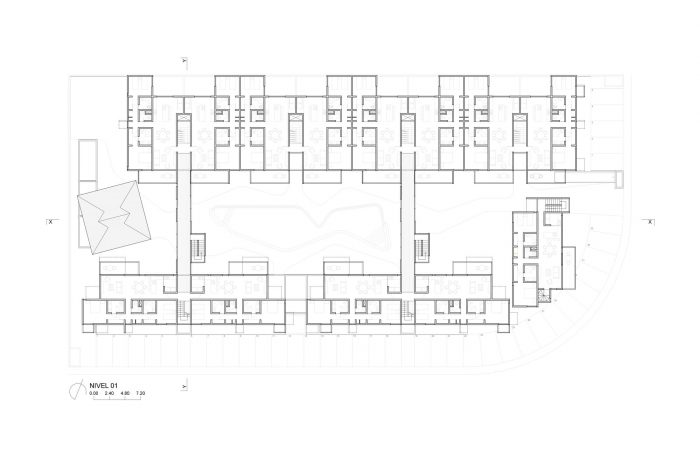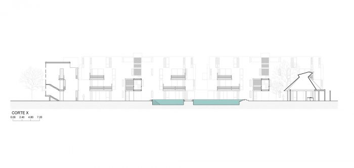 其结果是一套38套公寓,有三种配置,从2房和3房,110和220平方米不等。该项目还包括公共区域、停车场和服务区。总建筑面积为5600平方米,根据其在项目中的重要性和在3700平方米长方形地块中的位置,分布在四个不同大小的狭窄街区。两个街区有四层楼,高度为12米,从东到西贯穿整个地块,也能捕捉到自然风。第三座三层楼的建筑将短边封闭在地块的拐角处,可以俯瞰地块并将其与街对面的公园连接起来,并创造了一个通往综合体的自然通道。第四座建筑是服务设施和棕榈树,它的双倍高度可以保护项目的核心部分免受夕阳的影响,该部分被称为水和风的天井。这个大型的中央开放空间是将狭窄的街区对准周边的限制,从而实现了每个建筑之间平均16米的距离,确保了理想的视觉距离,同时也配置了一个55米长的广阔空间,游泳池就位于其中。需要指出的是,在街道上,这个宽阔的纵向空间完全可以供行人通行,这要归功于两座桥的加入,这两座桥将长长的街区连接起来,同时通过消除通道上的楼梯,使循环更有效率。最后,水和风的天井不仅是综合体的召集人和分配空间,它本身也为项目的绿色和可渗透面积贡献了20%。它是居住在这个住宅区的特殊体验的一部分,它与它所处的非凡的热带和驯化环境的关系。