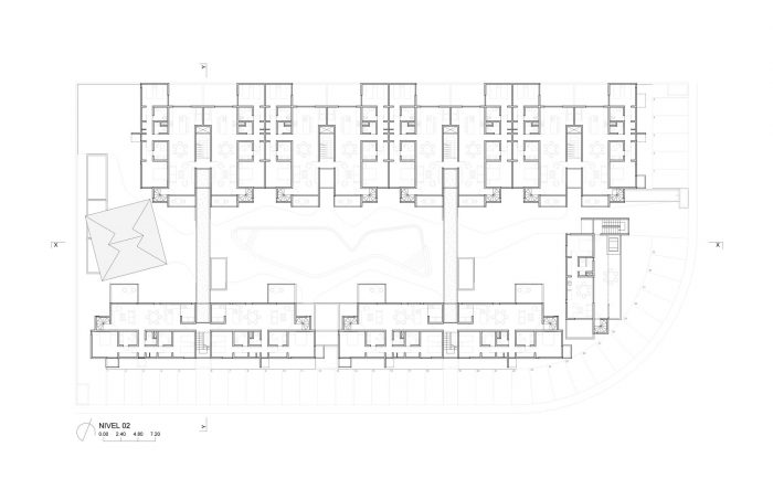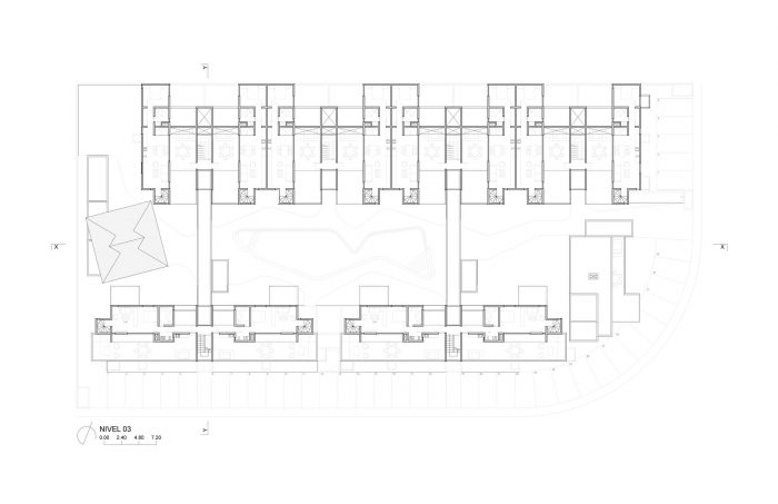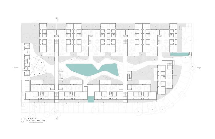 The result is a set of 38 apartments in three configurations, varying from 2 and 3 bedrooms and 110 and 220 sqm. The program also includes common areas, parking lot and service areas.The total built area is 5,600 m2, distributed in four narrow blocks of different sizes, according to their importance in the program and its position in the 3,700m2 rectangular plot. Two blocks have four storyes to a height of 12m and run across the plot from east to west, also catching natural breezes. A third three-story building closes the short side towards the corner of the plot that overlooks and connects the plot with the park across the street and creates a natural access plaza to the complex. The fourth block houses the services and the palapa, whose double height protects from the setting sun from the heart of the project named the patio of water and wind. This large central open space is the result of aligning the narrow blocks to the limits of the perimeter, thus achieving an average distance of 16 meters between each building that ensures a desirable visual distance, while at the same time configuring an expansive space of 55 meters long where the swimming pool is located. It is important to point out that at the street level, this wide longitudinal space is completely free for pedestrian traffic, thanks to the addition of two bridges that join the long blocks and at the same time make circulations more efficient by eliminating flights of stairs at the access level. Finally, the patio of water and wind not only is the convener and distributor space of the complex, it also contributes in itself for 20% of the green and permeable area of the project. It is part of the particular experience of inhabiting this housing complex in its relationship with the extraordinary tropical and domesticated environment in which it is located.
