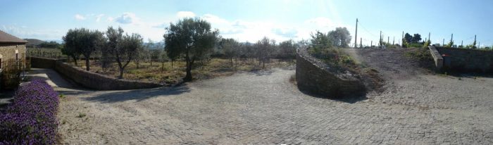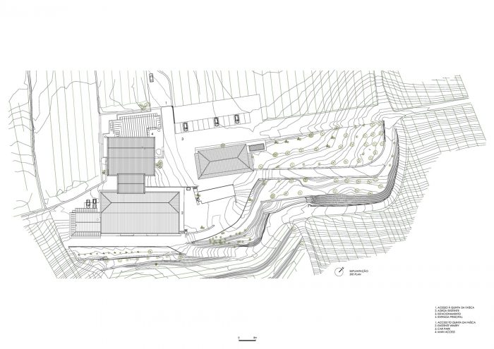 Certainly, the rupture of form and materiality is very common in contemporary architecture, but I considered that this should not be the route to take. Olive trees and slate walls were moved, the fall from the main entrance down to the upper level entrance to the winery building was made use of. Paths and access points were re-considered.