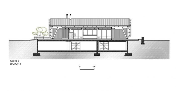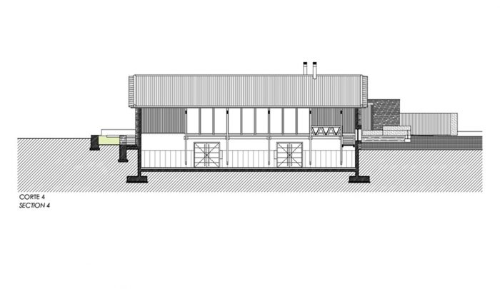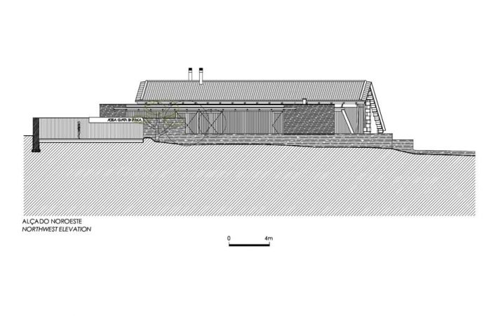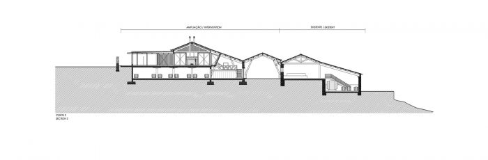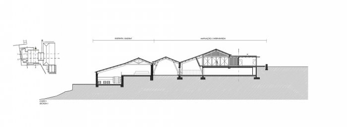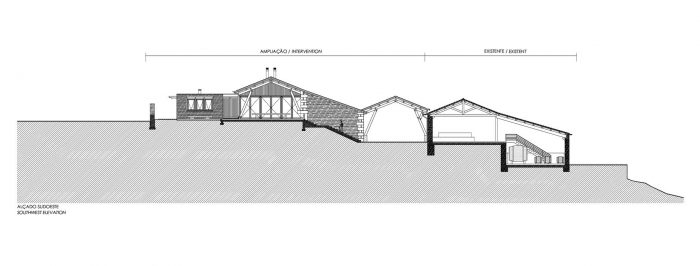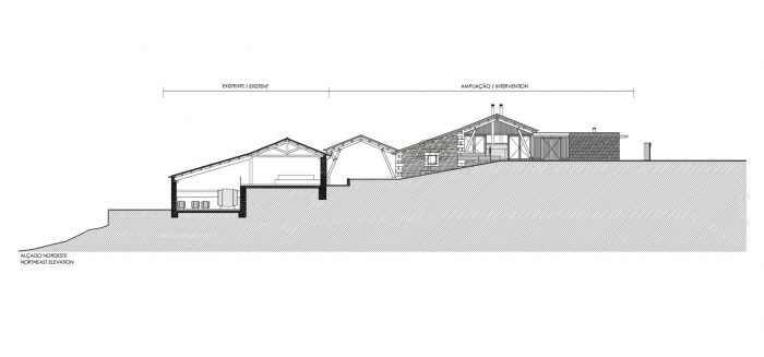 The volume covered by the large roof, (which is very similar to the existing), where, on first floor level there is a big hall to host guest receptions. There are two terraces, one to the North, to receive visitors, one to the South to enjoy the landscape and the succession of mountains and valleys that takes us all the way to the Douro which shaped them and still does.