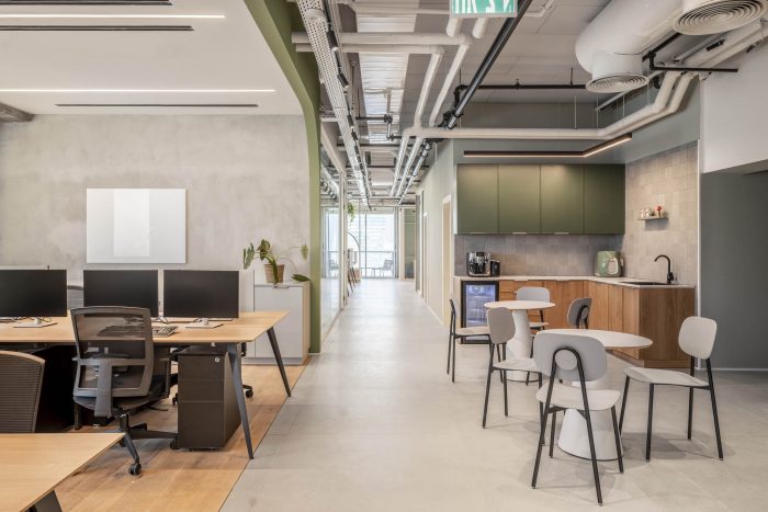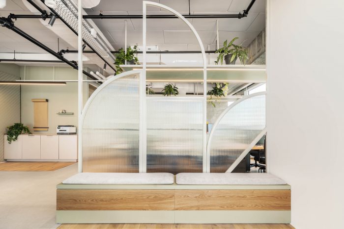 Quotient Technology的办公空间中最大的中央会议空间之一是厨房和餐饮区。一个长条形的吧台、食堂座位、双水槽以及大量的微波炉和冰箱意味着不用担心无法满足所有人的需要。这个空间还向员工和访客介绍了整个办公室设计中的明亮、干净和特别的绿色设计主题。整个商数科技办公空间给人的感觉是思想在这里种植和绽放。绿色的点缀突出了空间中的植物和绿植,加倍体现了赋予新思想以生命的概念。绿色在商祺科技众多工作空间中的一个继续,这是一个半私人的工作站群,非常适合项目团队工作。自然的木质色调有助于软化明亮的绿色,并为办公室的明亮、开放感觉做出贡献。时髦的几何镜取代了传统的墙面艺术,使这个小而分明的空间感觉比实际大一些。