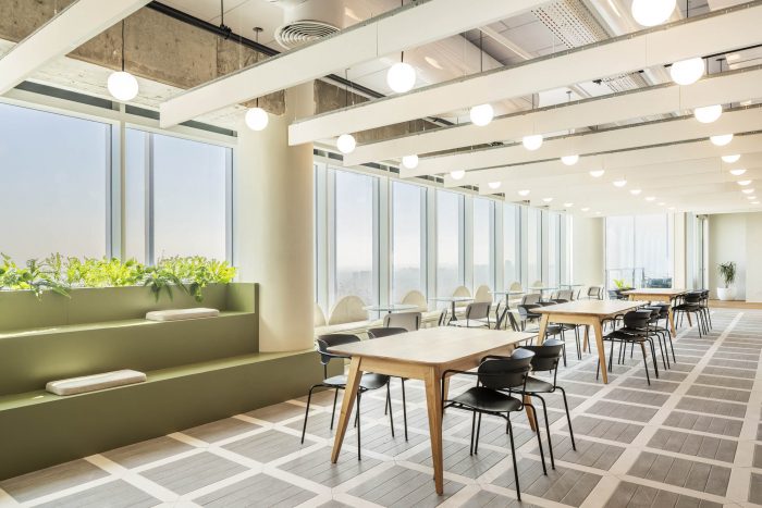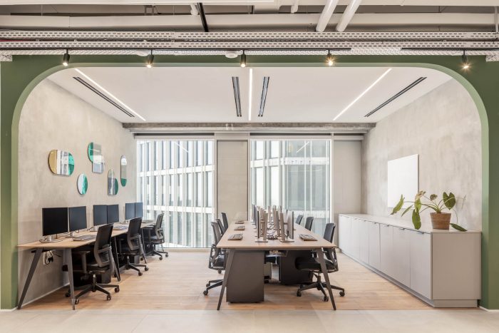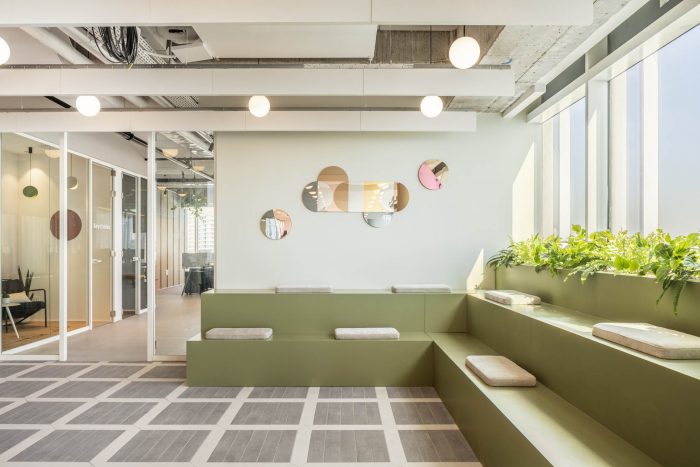 One of the largest central meeting spaces in Quotient Technology’s office space is the kitchen and dining area. A long bar, cafeteria seating, double sinks, and plenty of microwaves and fridges mean no worrying about accommodating everyone. This space also introduces employees and visitors to the bright, clean, and exceptionally green design motifs that will be present throughout the office design. The whole Quotient Technology office space carries with it the feeling that ideas are planted and bloom here. Green accents highlight the plants and greenery in the space, doubling down on the concept of giving life to new ideas. Green continues in one of many Quotient Technology workspaces, a semi-private cluster of workstations perfect for project teams to work. Natural wood tones help soften the bright green and contribute to the bright, open feel of the office. Funky geometric mirrors take the place of traditional wall art and help the small, divided space feel a bit bigger than it is.