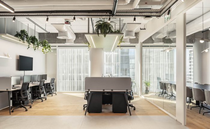 另一个工作空间既提供了一个协作的团队空间,也提供了更多私人的传统工作站,毗邻一个华丽的落地窗,展示了城市的面貌。植物生命在这里绽放:在悬挂的天花板架子上,沿着窗户,在地板上的花盆里。这个空间里的一对秋千给人一种年轻的感觉,为渴望快速休息的员工提供了一种活动。在Quotient Technology,会议空间很容易成为需要快速休息的团队的游戏空间。舒适的休息室和长长的天然木椅提供了多种座位选择,使私人会议对每个人来说都能感到更舒适。