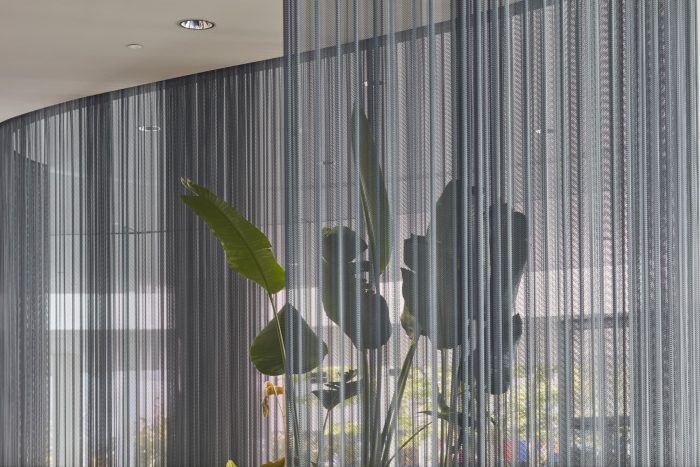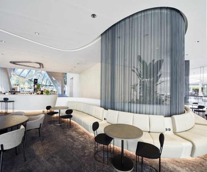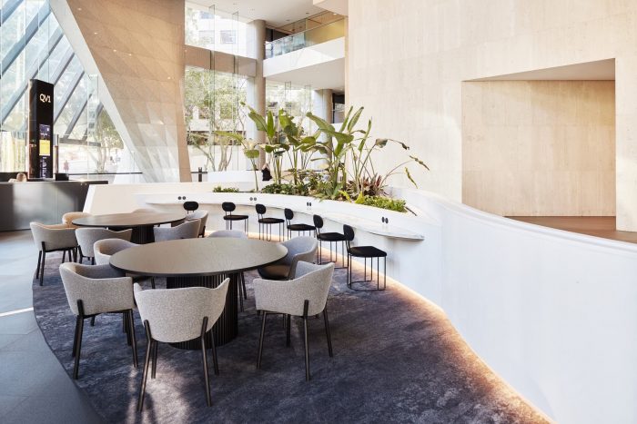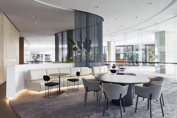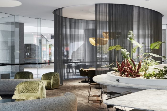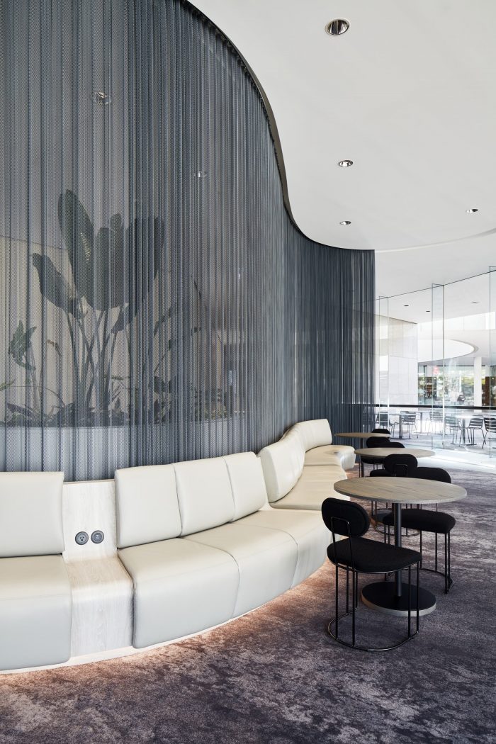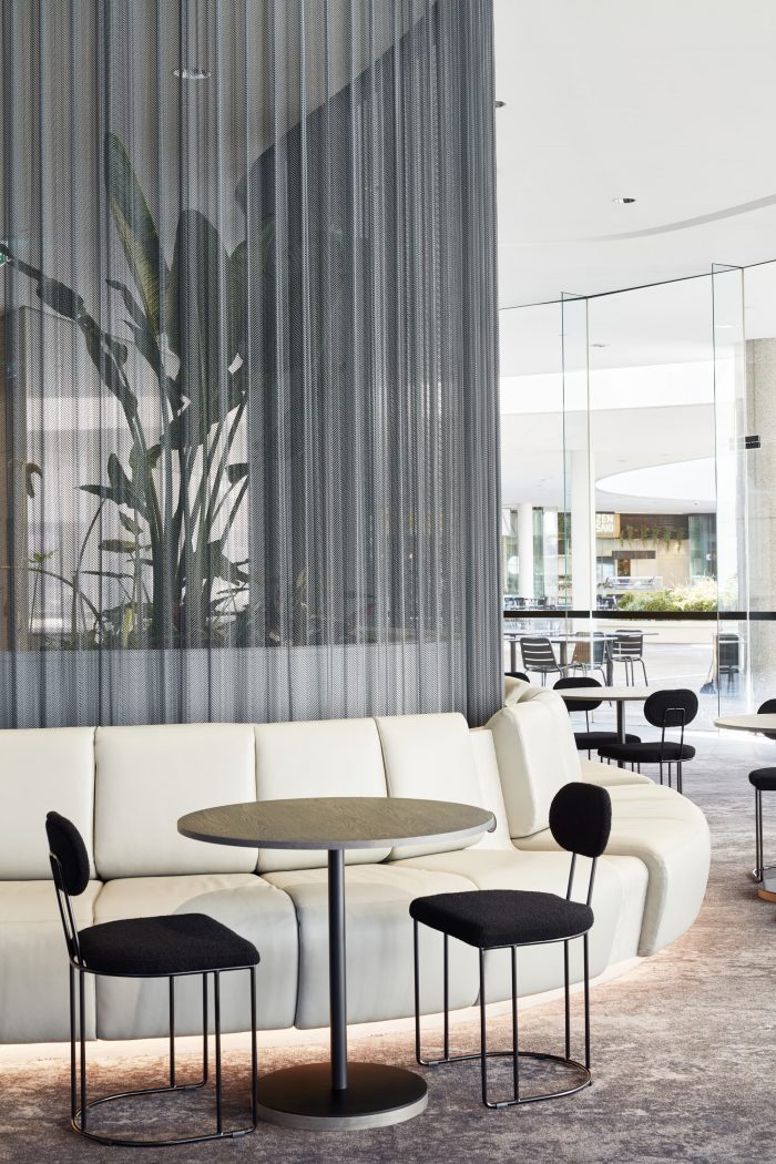 The lobby has been seamlessly divided into different public and private zones, visually demarcated by an organic joinery ‘ribbon’ – inspired by the external curved architectural elements of Seidler’s architecture – filled with lush greenery and strategically placed banquet seating that sweeps from one end to the other, in a reflection of the curvature and modernist aesthetic of the external architecture. The ribbon gestures into the 14-metre-high ceiling through mesh curtains that follow the wave of its line and provide vertical delineation and visual privacy between calm spaces and busy thoroughfares.