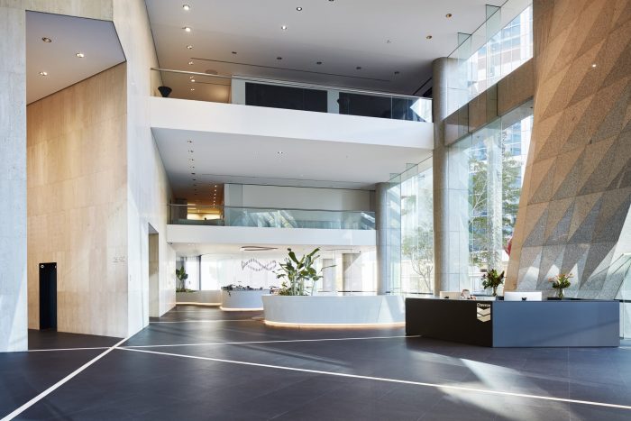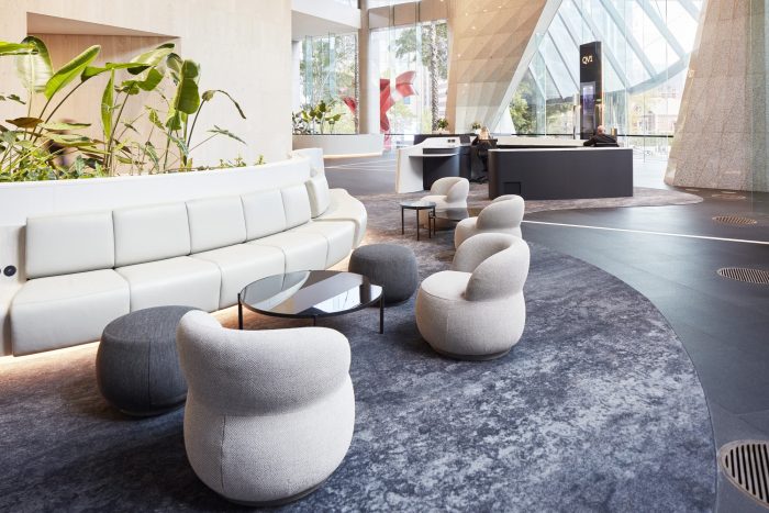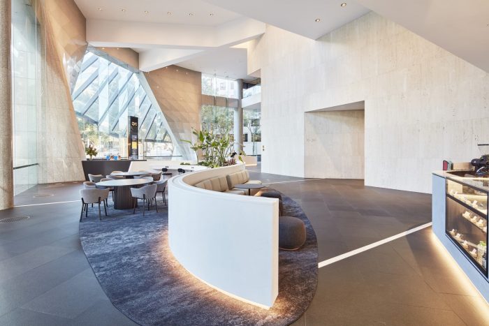 Drawing from studies on human movement, scale, and sightlines, the multipurpose lobby design includes a variety of spaces from private work settings to social gathering areas across its generous 1215m2 ground plane, with premium hotel-inspired details woven throughout. The design draws on principles from hotel and residential lobby designs to create a permeable ‘third space’ – a space between work and home. With the central idea of reclaiming the office lobby as public space, Plus Architecture Director Patric Przeradzki and Associate Giordana Vizzari set out to deliver a timeless design that supports a hive of different activity both during and after hours, providing opportunities for people to see and be seen – much like a traditional town square.