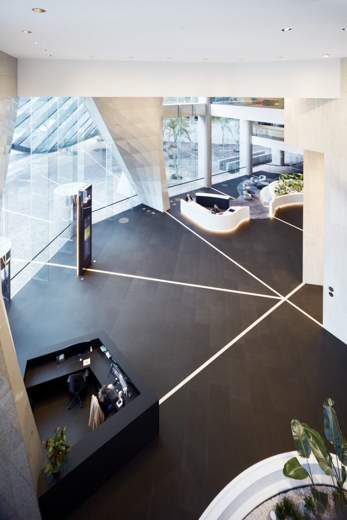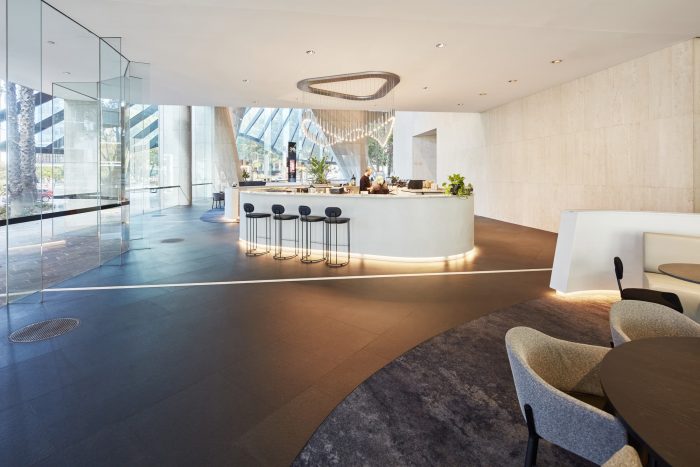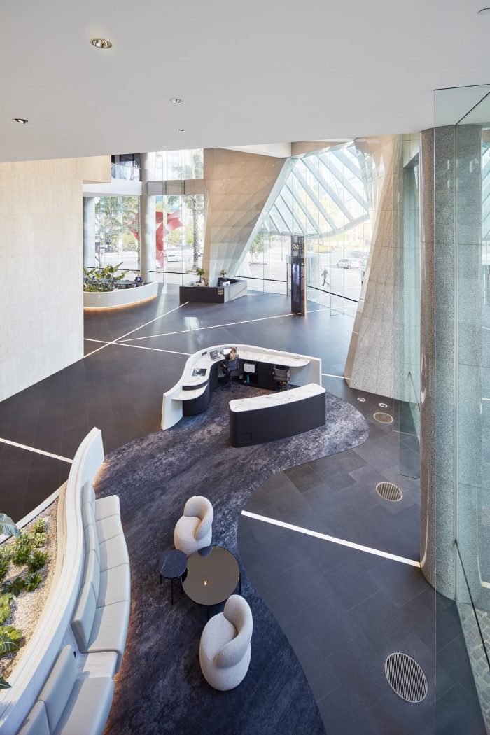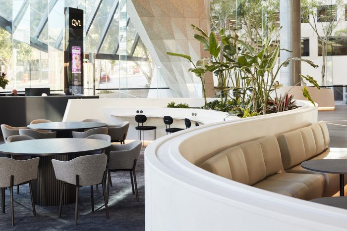 An unconventional lobby to one of Perth’s most iconic buildings, Plus Architecture’s QV1 lobby design is practical in its intuitiveness, yet striking, as it echoes the curvature and modernist aesthetic of Harry Seidler’s original architecture. Designed for Axa/Investa Property Group, the multi-million-dollar lobby refurbishment marks the first major upgrade to the lobby since the 43-storey office tower’s construction more than three decades ago. Developed in close collaboration with Harry Seidler & Associates to both reflect and complement QV1’s historic and prestigious architecture, the revitalised lobby serves as a welcoming entry point for the iconic business address.