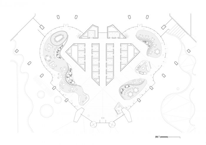 大厅被无缝地划分为不同的公共和私人区域,在视觉上由一个有机的细木工 "丝带 "来划分--其灵感来自于塞德勒建筑的外部弯曲元素--充满了郁郁葱葱的绿色植物和战略性地放置的宴会座椅,从一端扫到另一端,反映了外部建筑的弧度和现代主义美感。丝带通过网状窗帘与14米高的天花板形成姿态,网状窗帘跟随其线条的波浪,在平静的空间和繁忙的大道之间提供垂直的划分和视觉隐私。