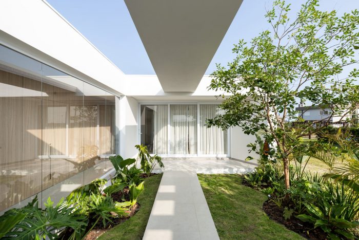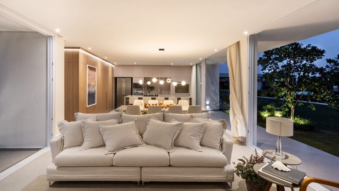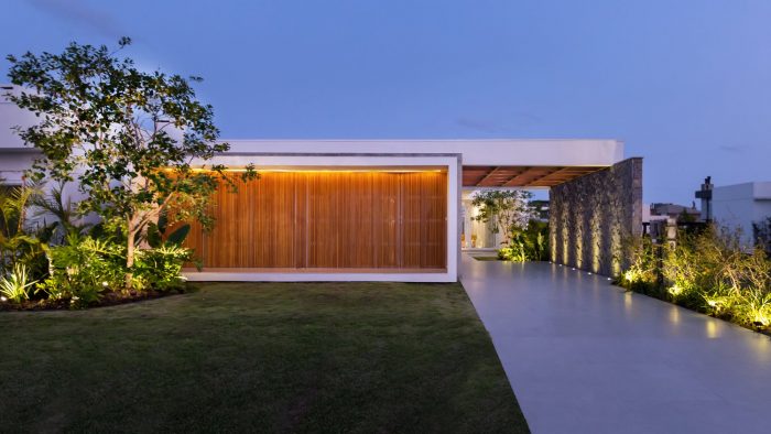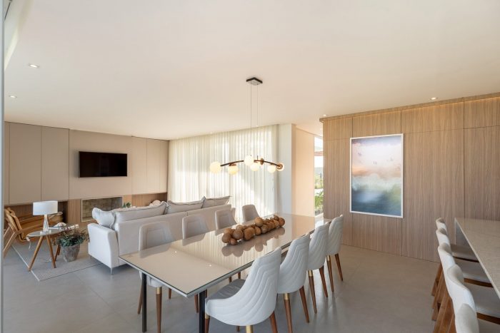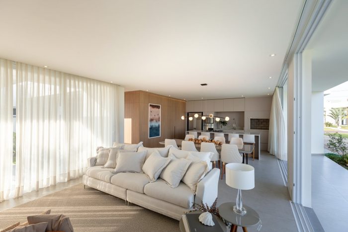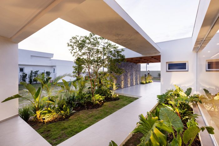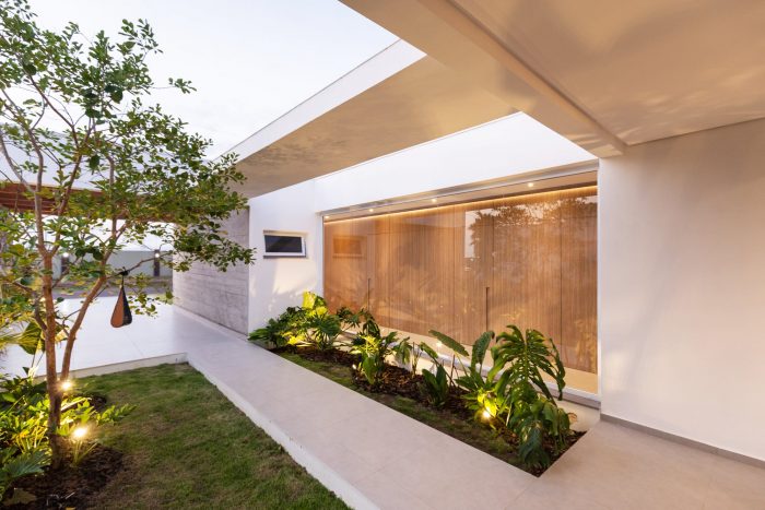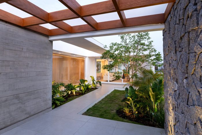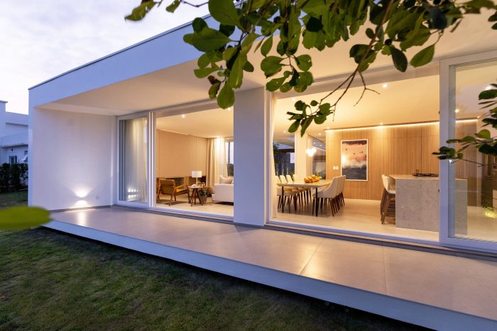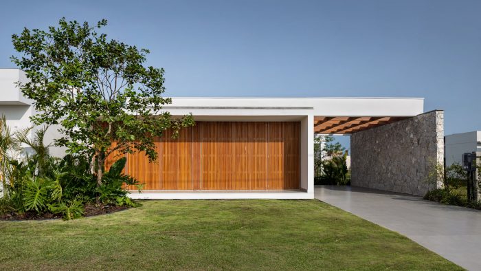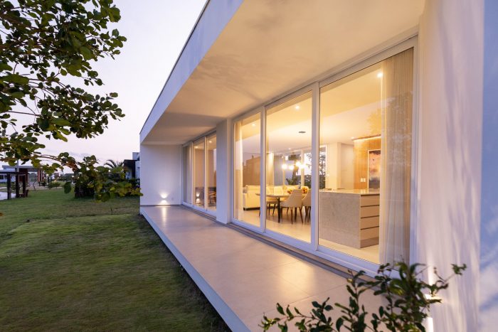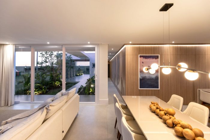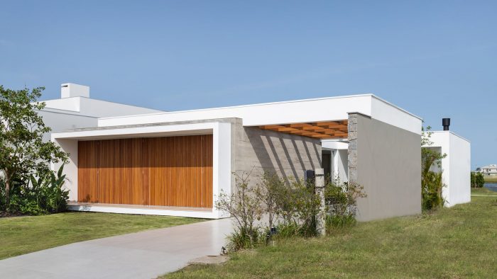 On the main facade, the textures chosen for the project are presented in their natural form: stone, exposed concrete, wood and the purity of white to contrast. The wooden brise-soleil set up in the volume that stands itself out protects the two suites from the setting sun. The house is accessed from the vehicle shelter covered by a wooden pergola, where a walkway directs the user to the rear area of the residence, allowing it to be discovered along the route. You arrive at the integrated social area that is oriented to the east and where the sun only falls in the morning. The area opens both to the inner courtyard and to the back of the lot, where a pedestrian path leads to the lake that winds through the condominium.