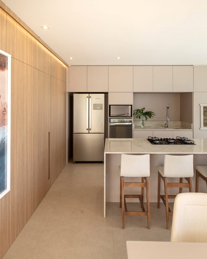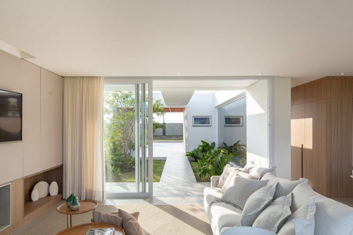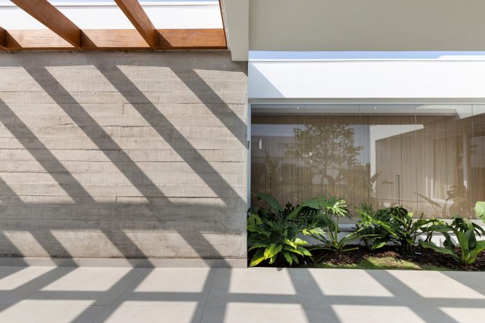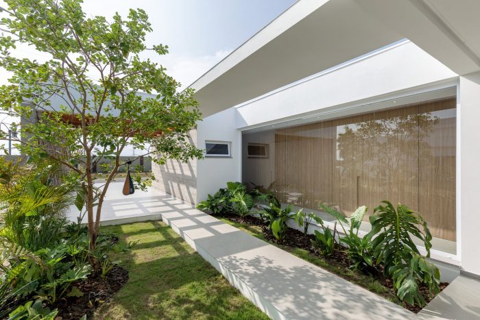 In the circulation that leads to the intimate area, there are, on one side, the doors camouflaged in the MDF panel and on the other, the vegetation of the internal patio. In the middle portion of the house, two other bedrooms share a bathroom. The internal palette in neutral tones - highlighting the woody panel of the circulation - combined with the tropical character of the external landscaping that includes fruit trees such as acerola and pomegranate, create the unpretentious, comfortable and relaxed face of the environments and an essentially simple way of living.