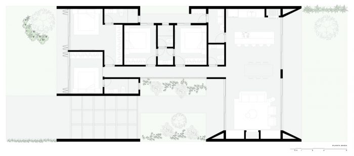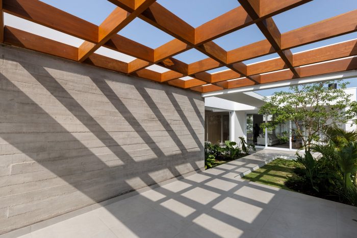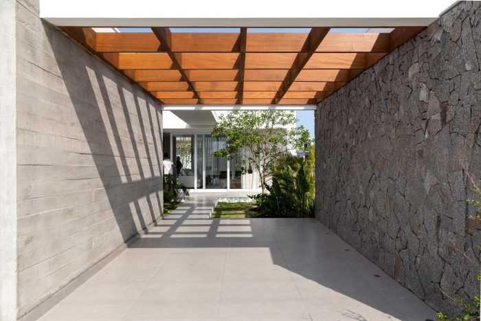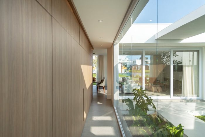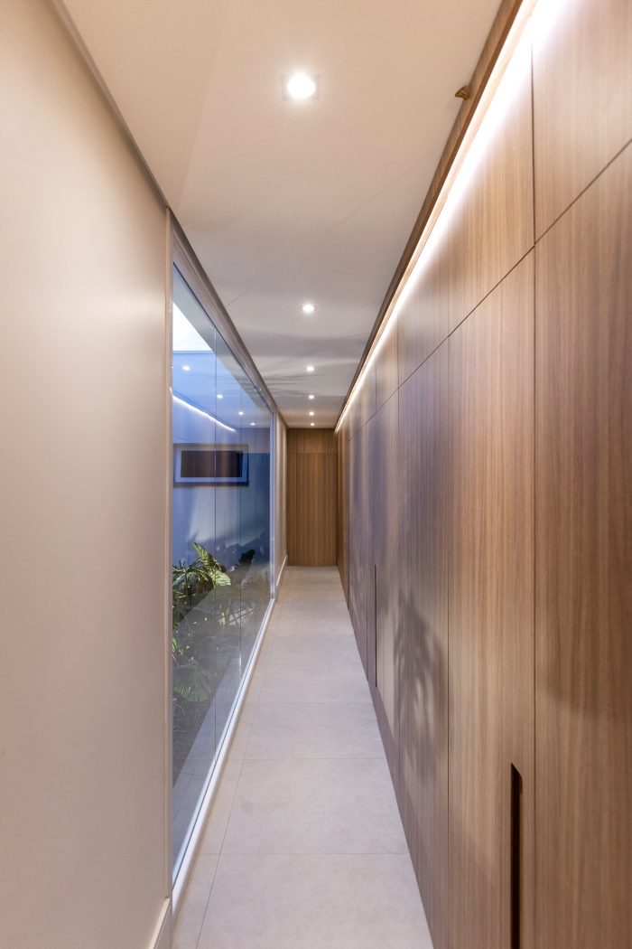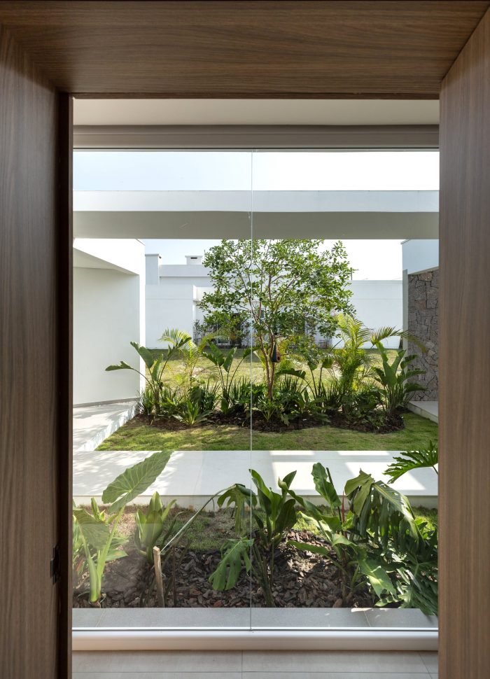在通往私密区域的通道上,一边是伪装在中密度纤维板中的门,另一边是内部庭院的植被。在房子的中间部分,另外两间卧室共用一个卫生间。内部色调为中性色调--突出流通的木质面板--结合外部景观的热带特征,包括针叶树和石榴等果树,创造出朴实无华、舒适和轻松的环境面貌,以及本质上简单的生活方式。