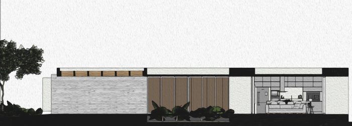 在主立面,为该项目选择的纹理以其自然形式呈现:石头、裸露的混凝土、木材和纯净的白色形成对比。在体量上设置的木制桁架顶棚本身就很突出,可以保护两间套房免受夕阳的影响。房子从木制凉棚覆盖的车辆遮蔽处进入,那里的走道将用户引向住宅的后部区域,使其可以沿途发现。你来到综合社交区,该区朝向东方,太阳只在早晨落下。该区域既向内院开放,也向地块背面开放,那里有一条人行道通往蜿蜒穿过公寓的湖泊。