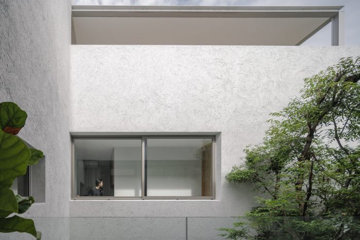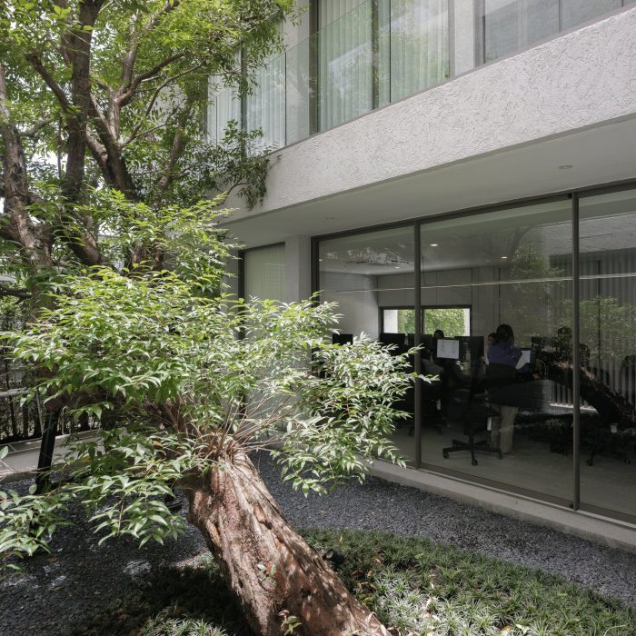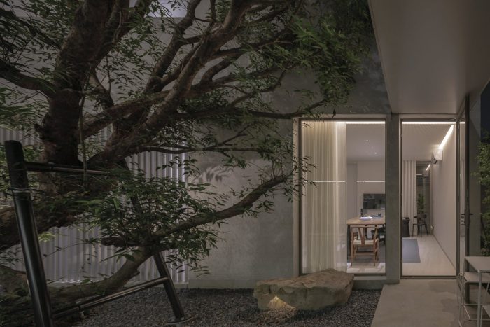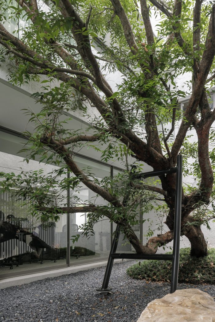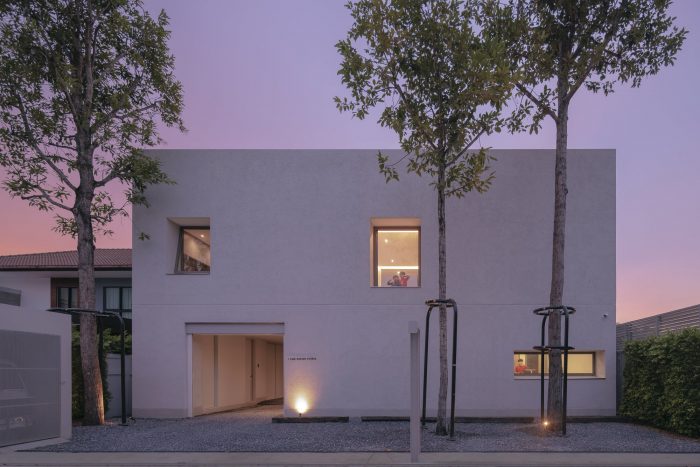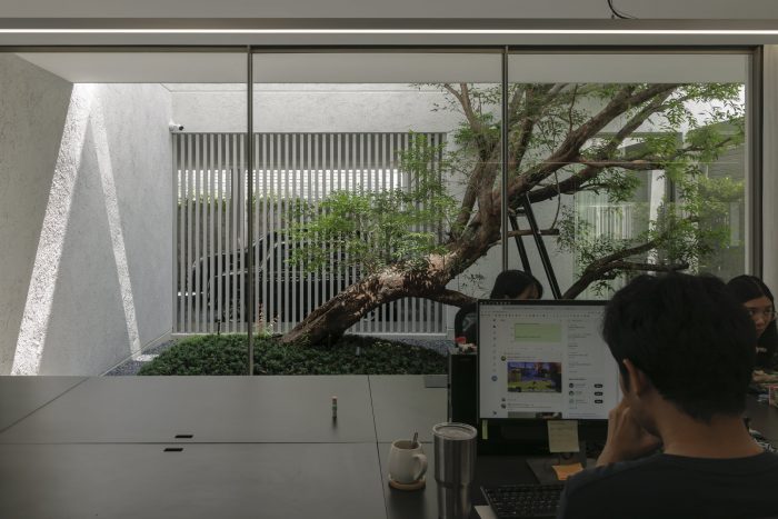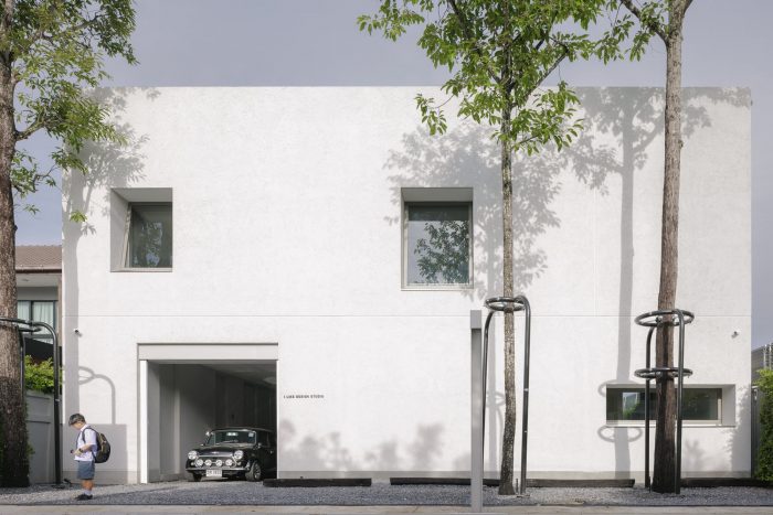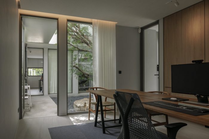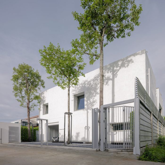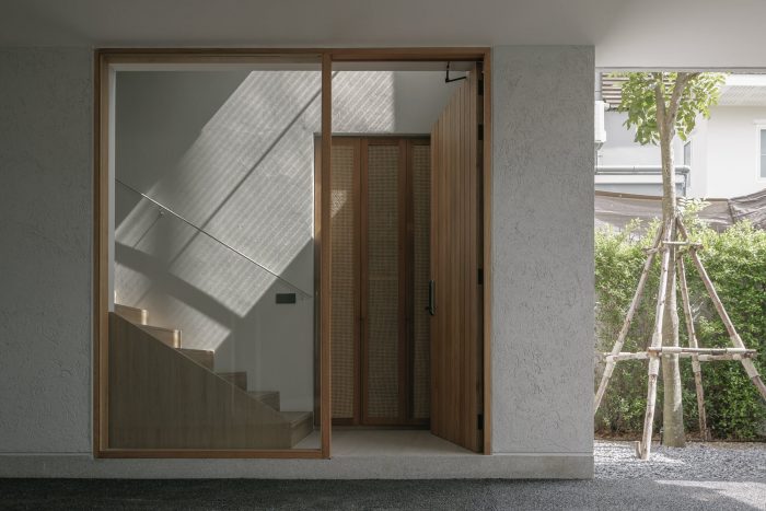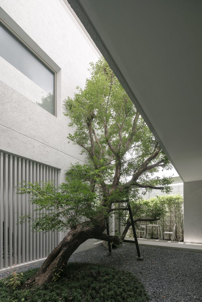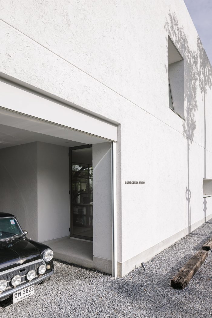 The front of the house is designed to recede into the land’s longest side to provide parking for employees and visitors. The floor was designed with gravel rather than concrete to reduce the hardness of the floor and make it look less like a parking lot. The parking line is divided by the tall trees in front of the house on the east side. The east wall is designed to be solid from the outside to provide privacy and prevent heat from entering the building. Sunlight shines on the walls every morning at sunrise, casting shadows and creating images of light and trees along the walls. Residents will admire and experience the light and shadow on the specially plastered, semi-handcrafted walls in that smoothness every morning. I think the dimension of shadows moving with the wind or with the time of day is beautiful.