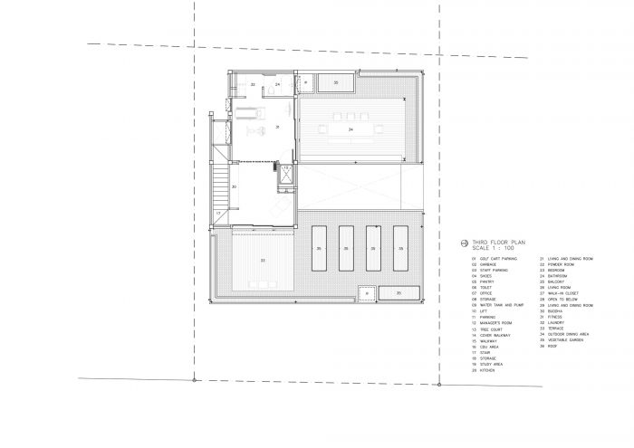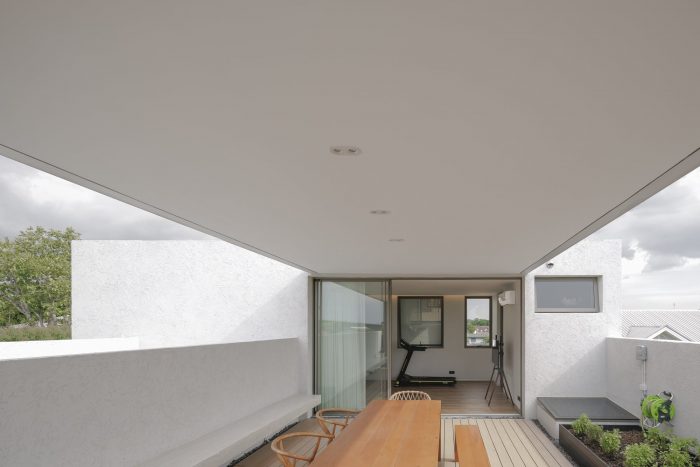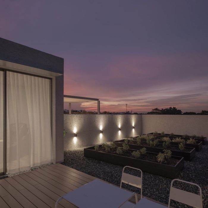 The rooftop is intended to be a place to plant a garden that will be used in the house. Residents will have the opportunity to reconnect with nature, experience the soil, cultivate, and slow down. These are uncommon in city life. The other side of the rooftop is set up as an outdoor dining area, with the edge of the wall raised to obscure the view of the surrounding environment. The only thing visible was the surrounding sky, which changed colors depending on the time of day.
