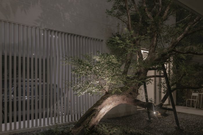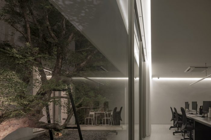 There are offices and parking lots on the ground floor. The house's center was designed as a tree court that opened to the sky. This is the main view from the office, which can be seen as a large bonsai with an oblique line leading the eyes to the sky. Only during the midday hours will sunlight shine through the leaves and down to the gravel floor below. Another thing that I think is very beautiful and will only be able to experience during that time is this.