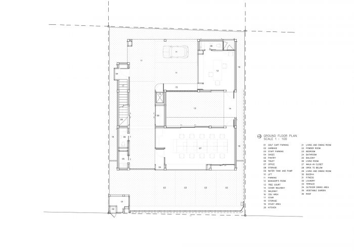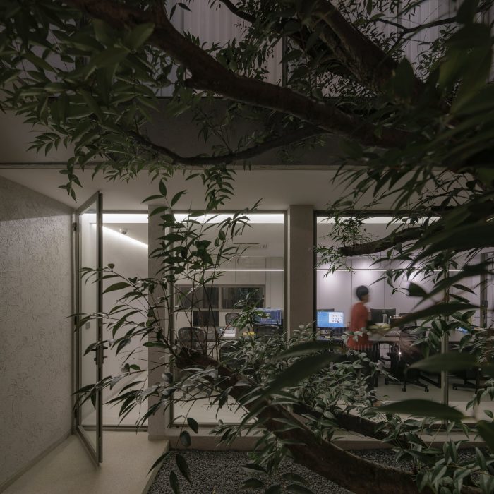 一楼有办公室和停车场。房子的中心被设计成一个向天空开放的树庭。这是办公室的主要景观,可以看到它是一个大盆景,有一条斜线将眼睛引向天空。只有在正午时分,阳光才会透过树叶,照射到下面的砾石地面。另一件我认为非常美丽的事情,只有在那个时候才能体验到,那就是这个。