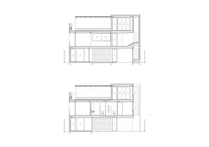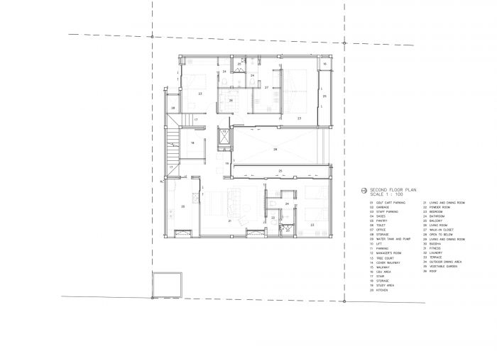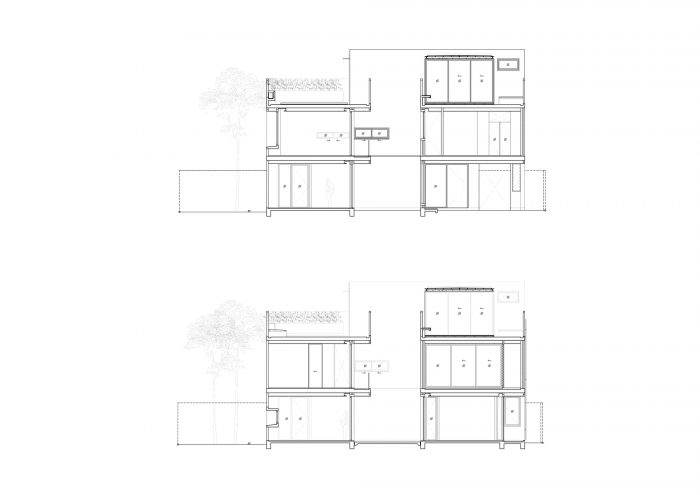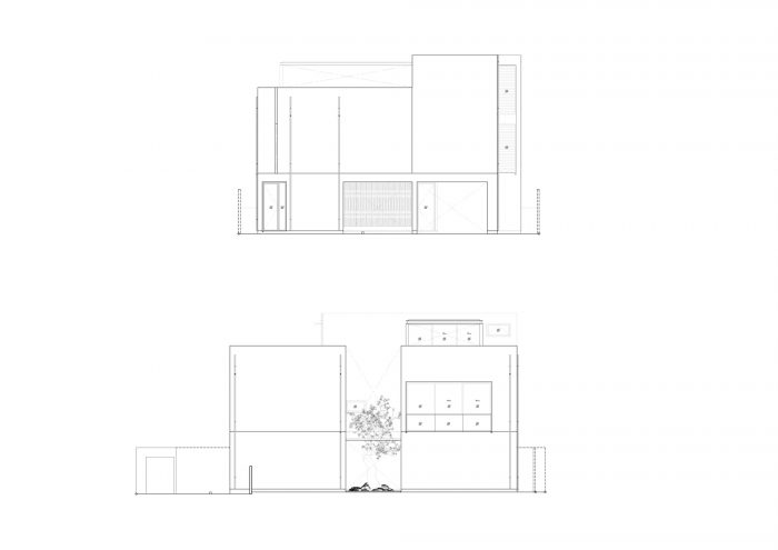 房子的前面被设计成退到土地最长的一面,为员工和访客提供停车位。地面的设计是用碎石而不是混凝土,以减少地面的硬度,使其看起来不像一个停车场。停车线被东侧房屋前的高大树木分割。东面的墙被设计成从外面看是实心的,以提供隐私并防止热量进入建筑。每天早晨日出时分,阳光照在墙上,投下阴影,沿墙创造出光和树的图像。住户们每天早上都会欣赏和体验那种光滑的特别抹灰的半手工墙面上的光和影。我认为影子随风或随时间移动的维度是很美的。