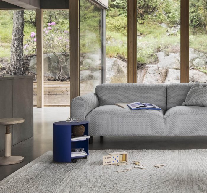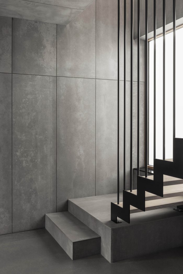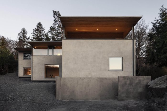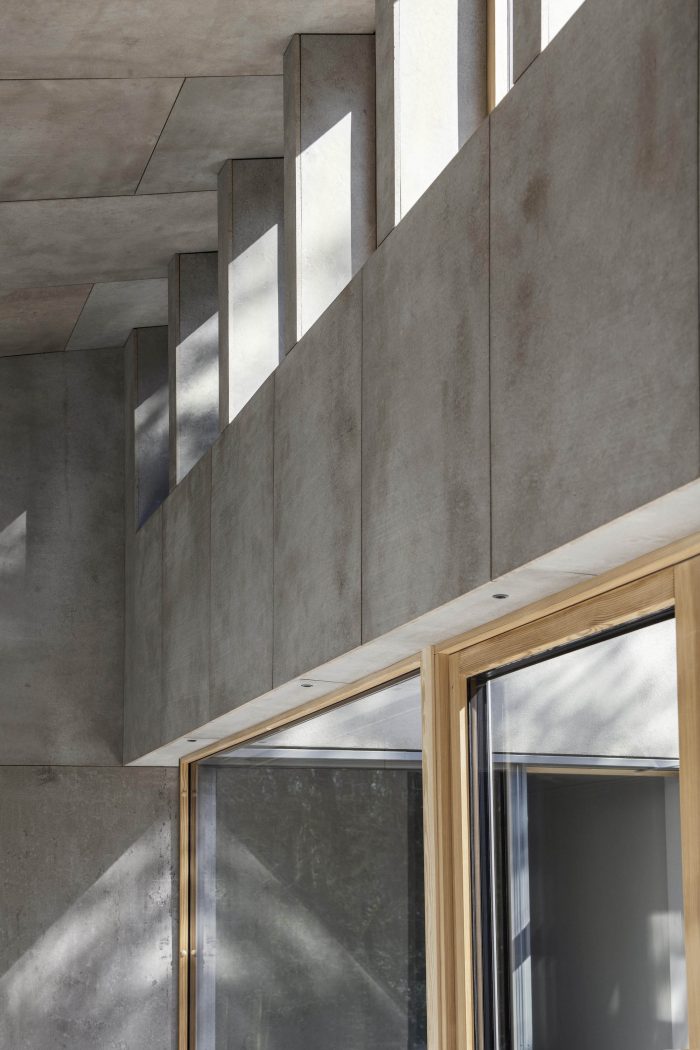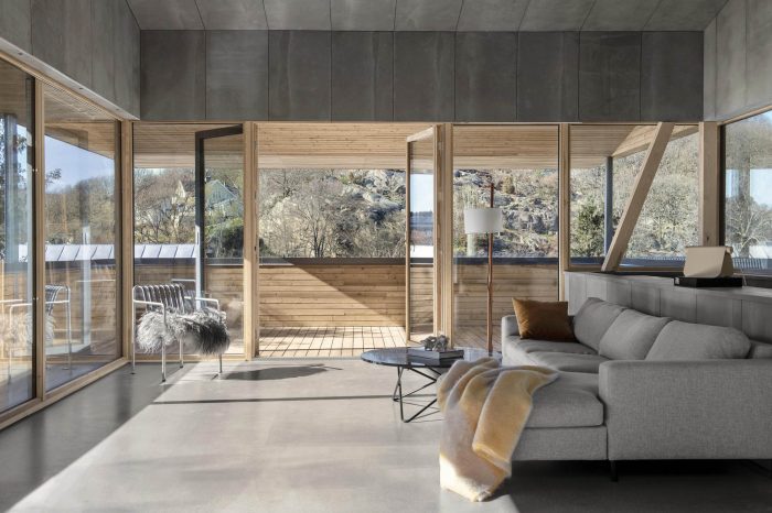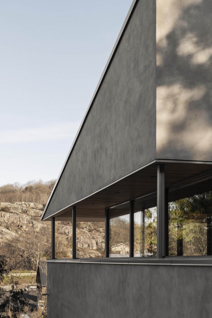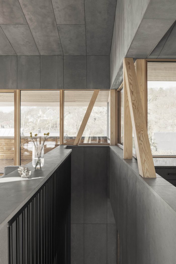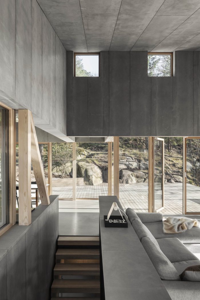 The construction materials are selected for the harsh Swedish west coast climate. The exterior is natural gray plaster, the inside of the terraces and exterior ceilings are clad in heat-treated pine and the roofs are covered by galvanized steel. The inside of the house is continuously gray with polished concrete floors, and walls and ceilings covered in composite boards consisting of a mixture of wood chips and concrete.
