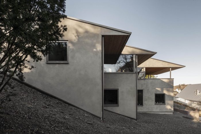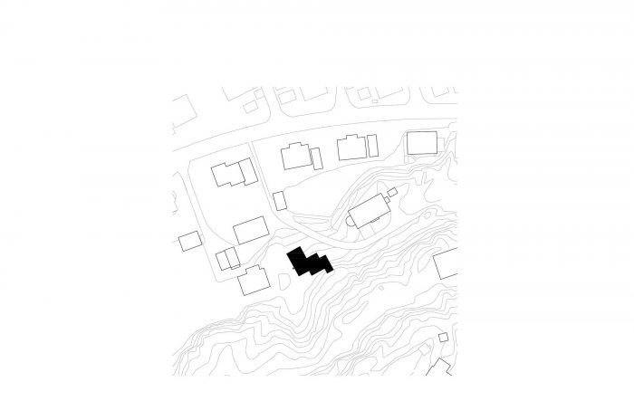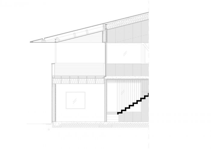 The second floor, containing the kitchen, a second living room, and balconies and terraces is like a command bridge: almost entirely glazed to create long views and take in the surrounding landscape. The rooms are interconnected horizontally but vary in section, with roof structures that misalign with the interior rooms. The intention is to achieve a spatial richness with variation both on the inside and outside.