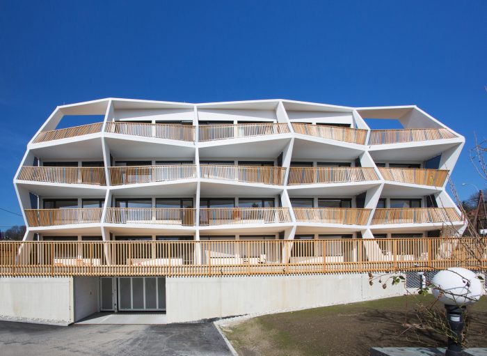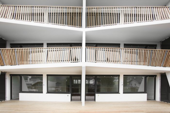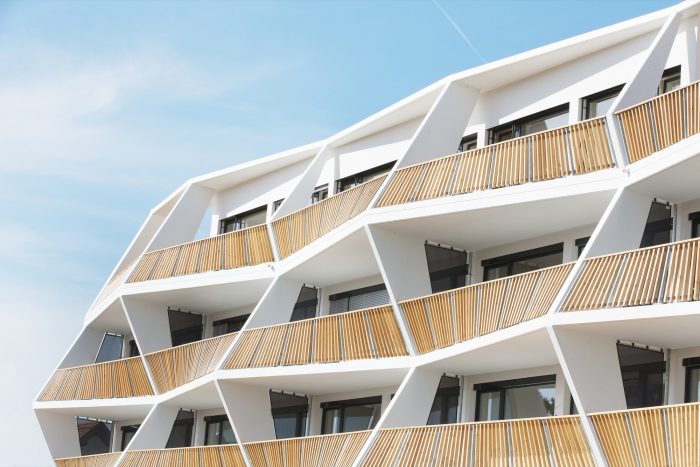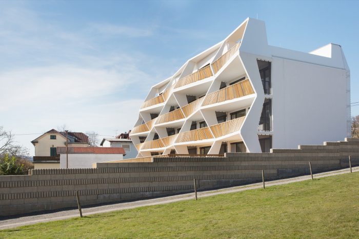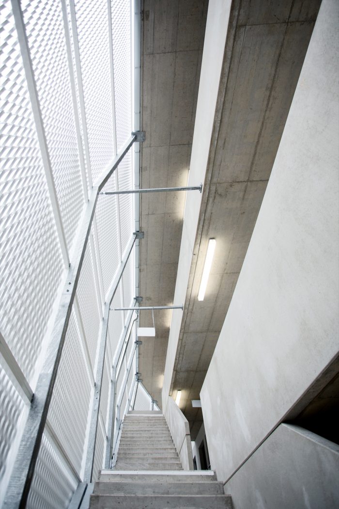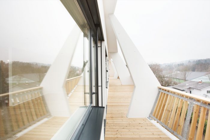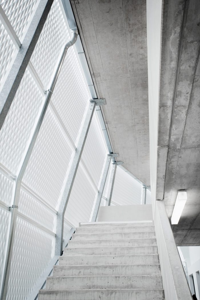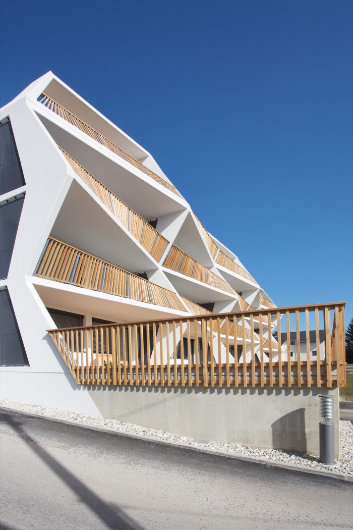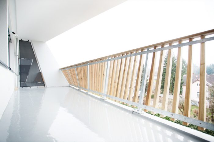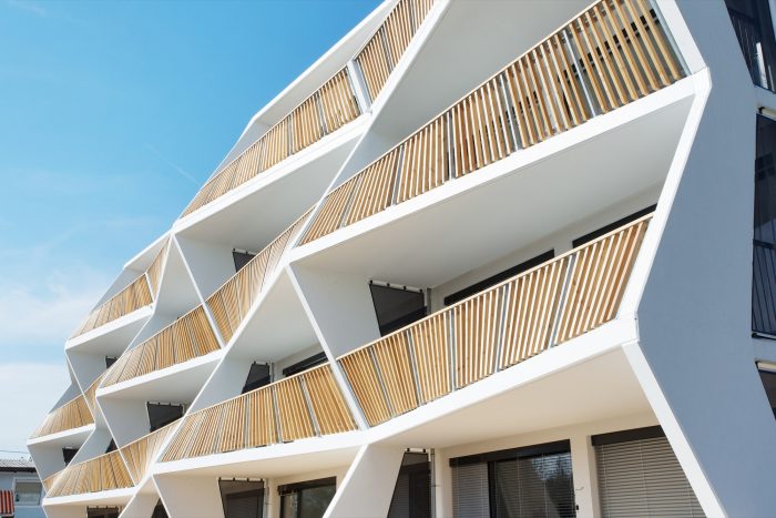 A structurally simple, systematic and efficiently designed base building structure houses all apartments. To the south, this structure is flanked by zigzag-shaped, spacious balconies, while the north side features a pergola opening encased in expanded metal. Thus, the building’s overall architectural character is defined by relatively inexpensive building components, such as the balconies.