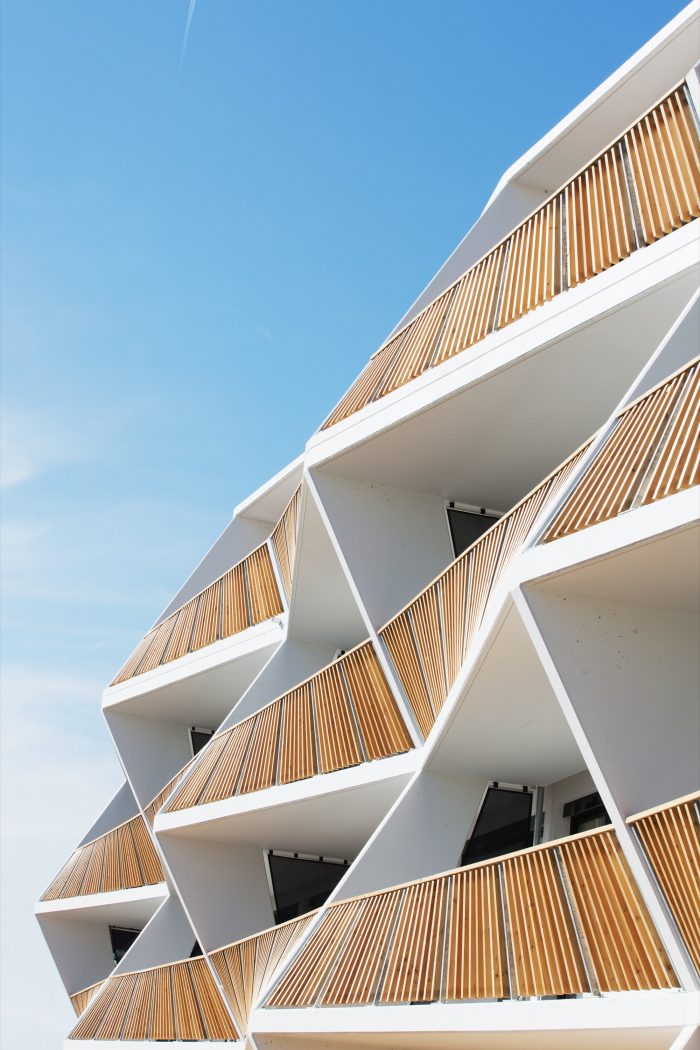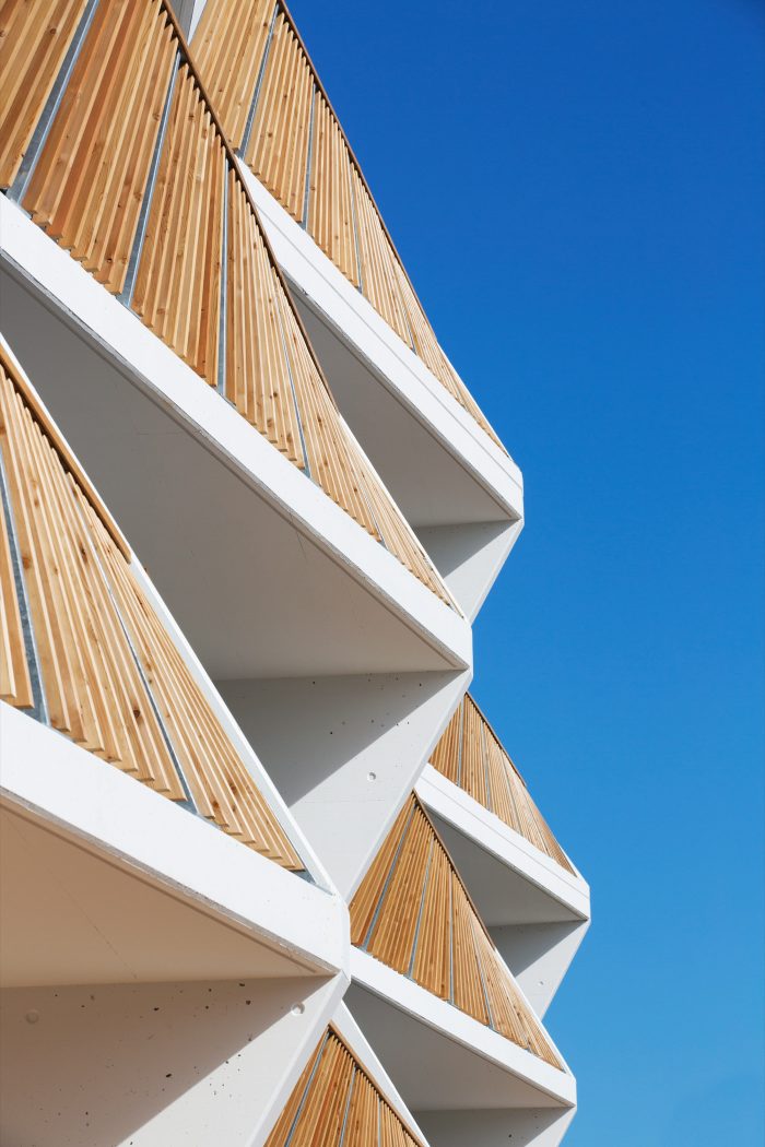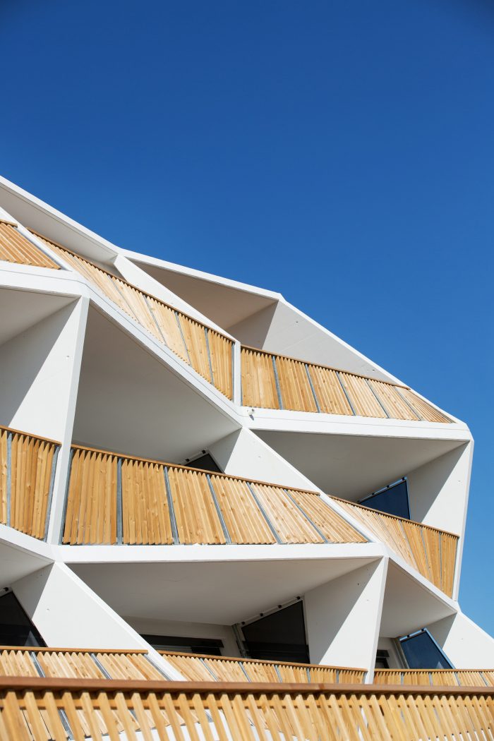 The larch-wood balcony railings are placed in a fan-like manner along the zigzag rhythm of the cantilever slab, with both materials and workmanship creating a homely atmosphere.