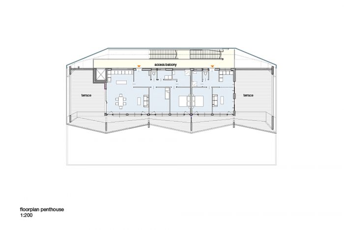 一个结构简单、系统化、高效设计的基础建筑结构容纳了所有的公寓。在南面,这个结构的两侧是曲折的、宽敞的阳台,而北面则有一个由膨胀金属包裹的凉棚开口。因此,该建筑的整体建筑特色是由相对廉价的建筑构件(如阳台)决定的。