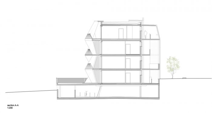 The building houses 15 small apartments (40-50m²) and one penthouse on the top floor, with a subterranean parking level below.