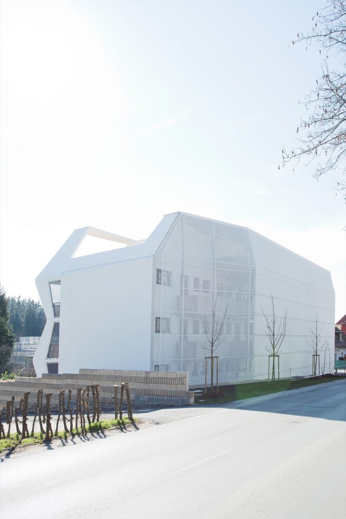 However, when approaching the building from the east, the façade appears closed and volumetric, which creates a kind of visual tilting effect as one passes the building. Overall, the appearance of the structure varies dramatically depending on the viewer’s perspective, which gives the building a very sculptural and three-dimensional feel.