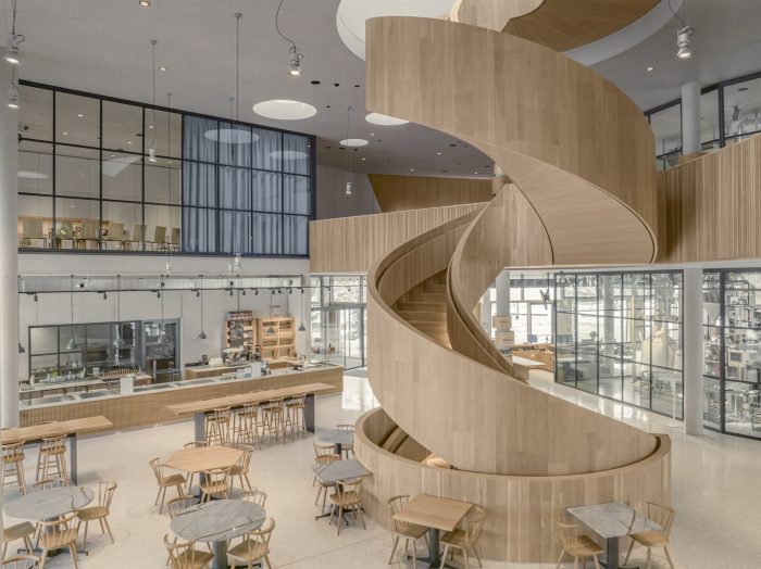 游客从两个平等的入口中的哪一个进入建筑,他都是通过中心接待和分配的。釉面的内部隔断使人们可以大方地看到咖啡烘焙室和面包房。诱人的螺旋形楼梯雕塑将底层和上面的画廊连接起来。