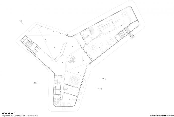 The gesture is accompanied by the large, floating roof that spans everything and wraps itself around the visitor center like a band, but does not limit inside and outside views.