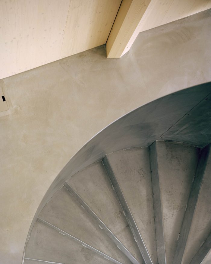 Today, the multifunctional building is made available to innovative start-up companies in the tech sector. It has a large meeting room on the gallery and a small one on the ground floor next to the concrete core, which provides a kitchenette, as well as the wet cells and building services. The two floors are connected via a free-standing spiral staircase made of galvanized steel, which forms the heart of the main room as an eye-catcher.