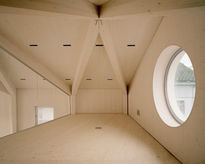 The existing, expansive wooden structure made of layers of beams, struts, and clamps was dismantled in the course of the roof renovation and replaced by a more efficient one, which today makes the entire room height tangible. Glued laminated timber trusses with a conical cross-section span the 12 meters wide main room and describe a visually appealing, net-like structure on the underside of the roof.