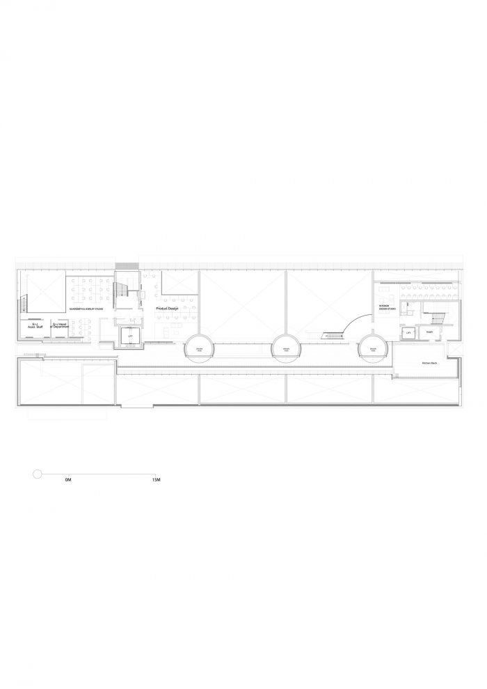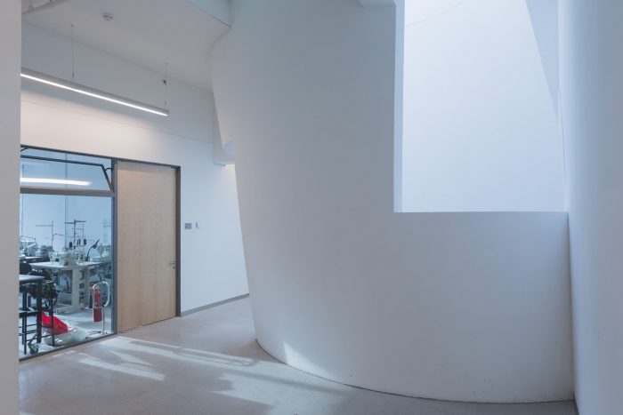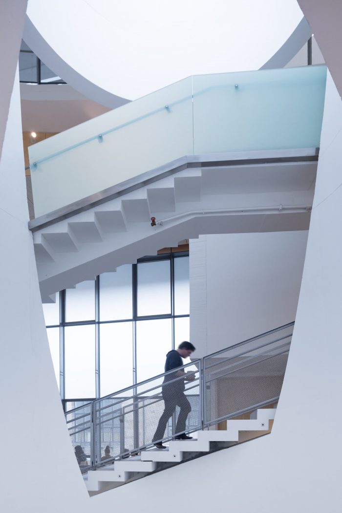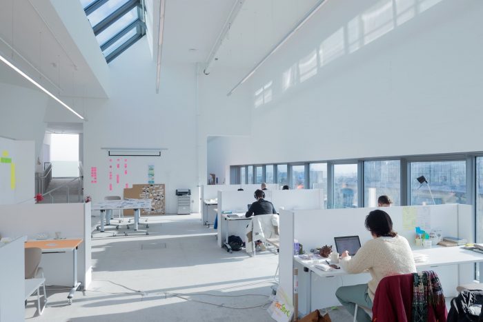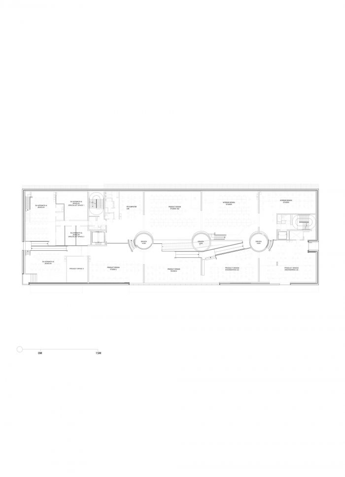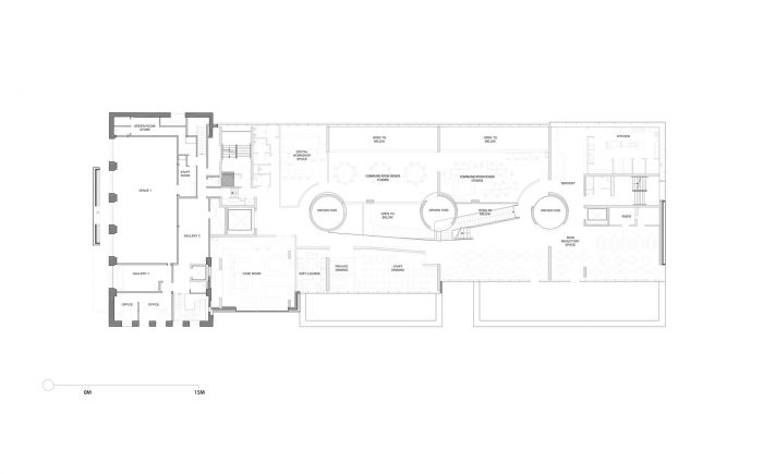 “Driven voids of light” allow for the integration of structure, spatial modulation, and light. The “driven void” light shafts deliver natural light through the depth of the building providing direct connectivity with the outside world through the changing intensity and color of the sky. In addition, they provide vertical circulation through the building, eliminating the need for air conditioning.